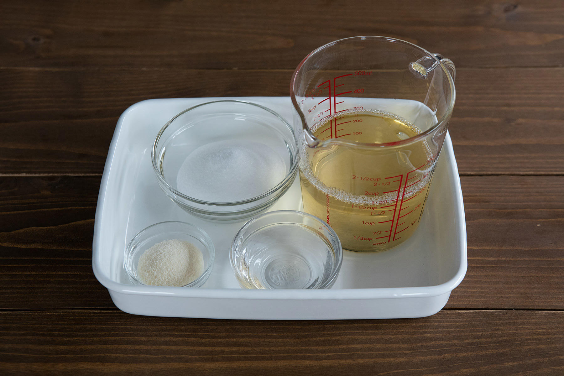 レモン汁を加えて酸味を加えます。レモンに含まれる酸もゼラチンの働きを邪魔しますが、液体量の10%以下であればちゃんと固まります。