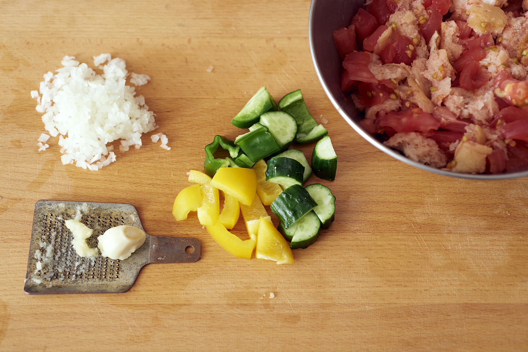 ガスパチョのつくり方は、ミキサーかハンドブレンダーがあれば簡単。煮込みは一切不要で、すべての材料を生のまま、ミキサーにかけるだけです。本格的につくるときは、食材選びと下ごしらえに気を配りましょう。