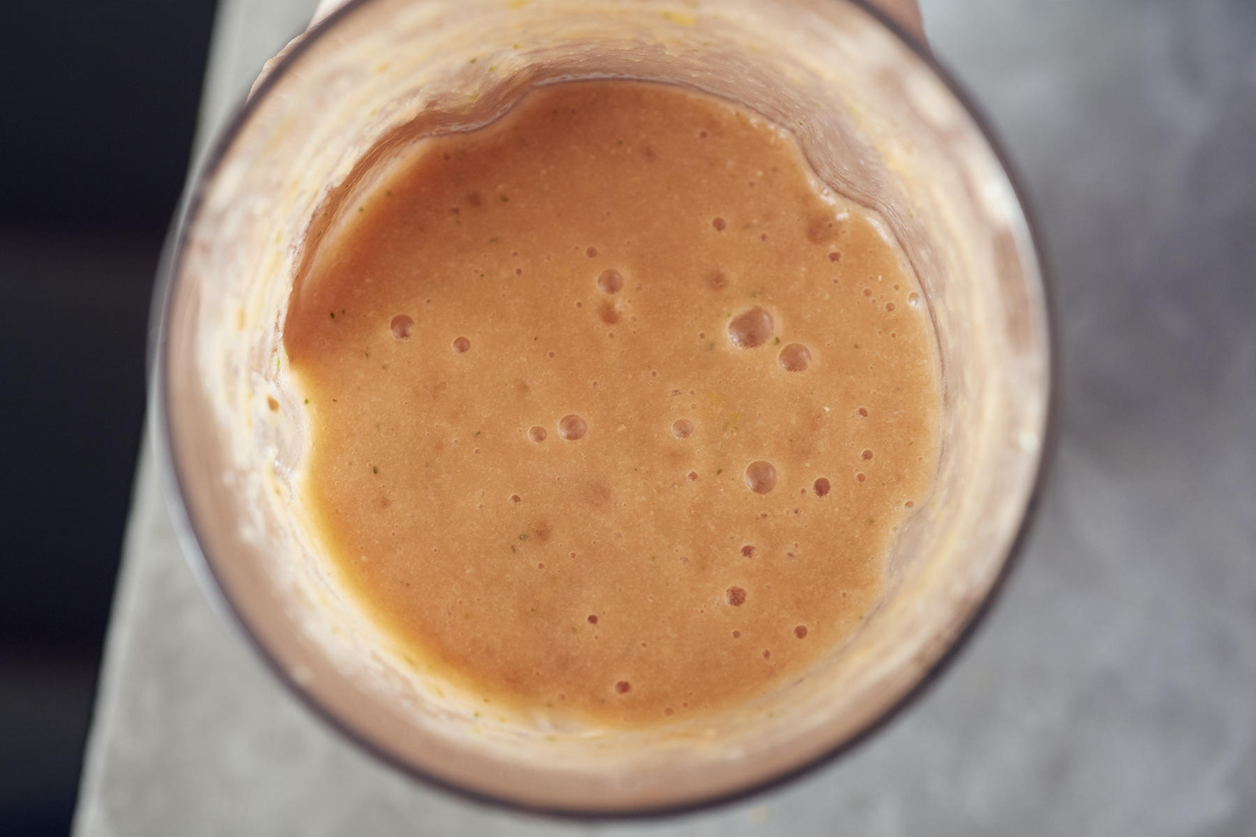 下準備をしたトマトとパン、玉ねぎ、飾り用以外のきゅうり、ピーマン、パプリカとにんにく、水、白ワインビネガー、パプリカパウダー 、クミン、オリーブオイルをミキサーに入れて撹拌する。野菜の形がなくなり、液状になったら冷蔵庫で1時間冷やす。