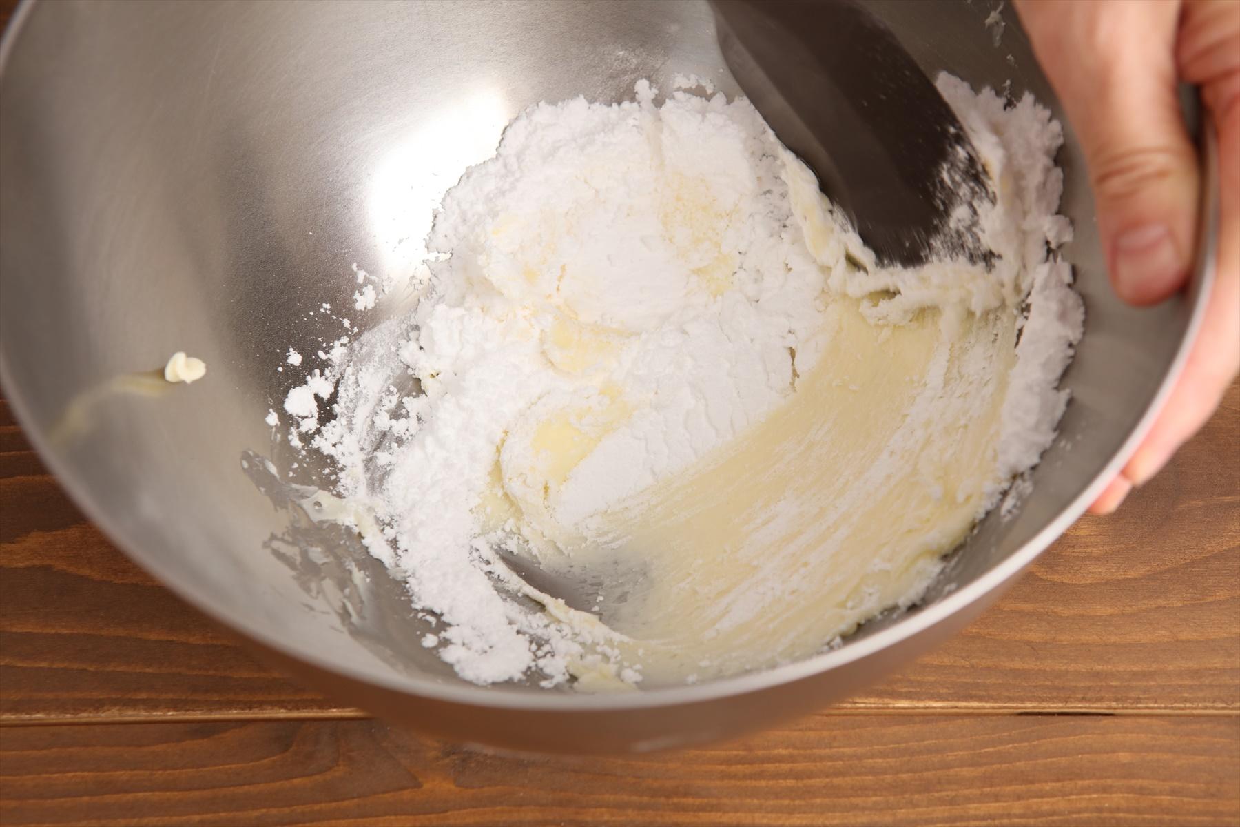 ボウルにバターを入れて形がなくなるまでゴムベラで練る。粉砂糖を加えて粉っぽさがなくなるまで混ぜる。