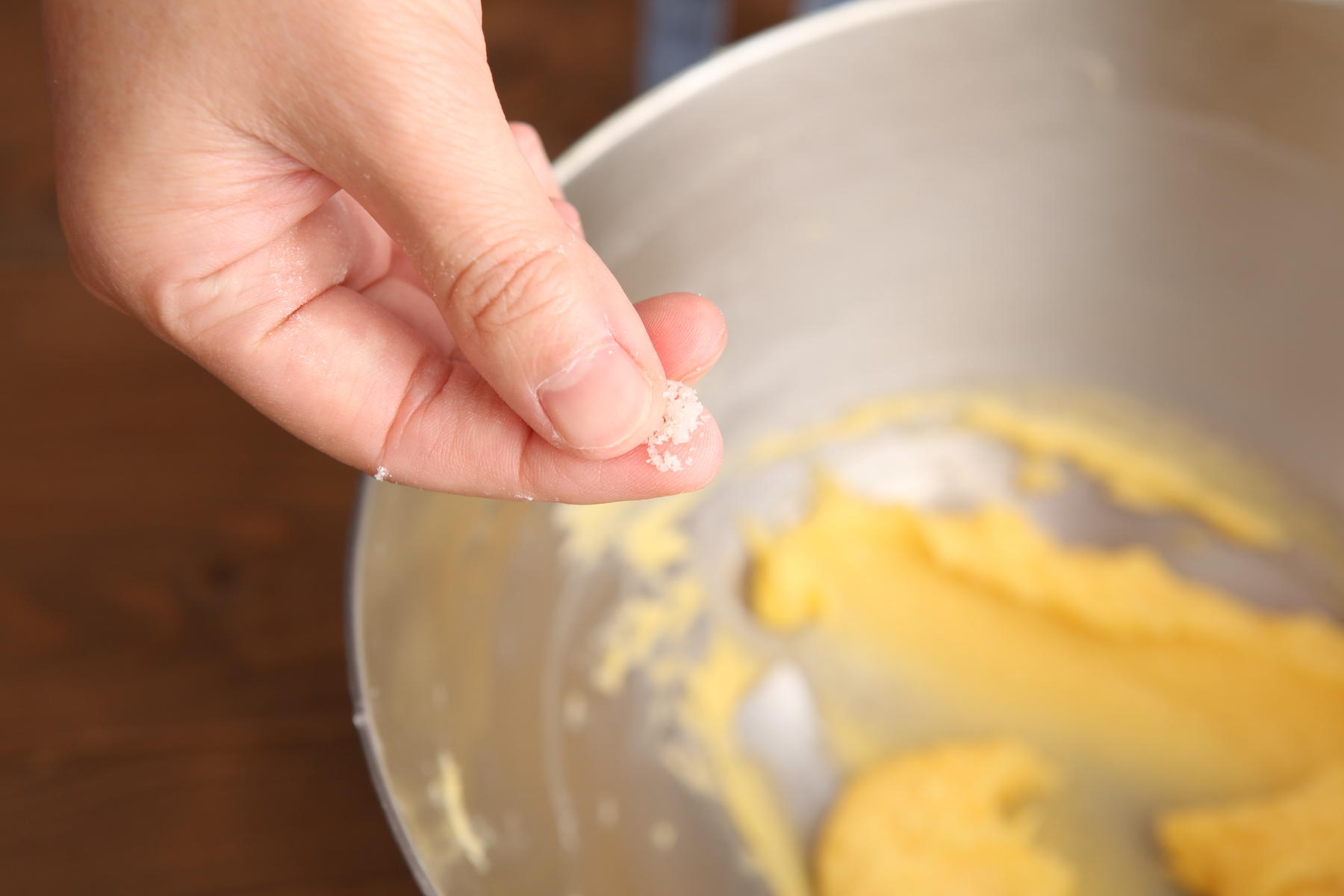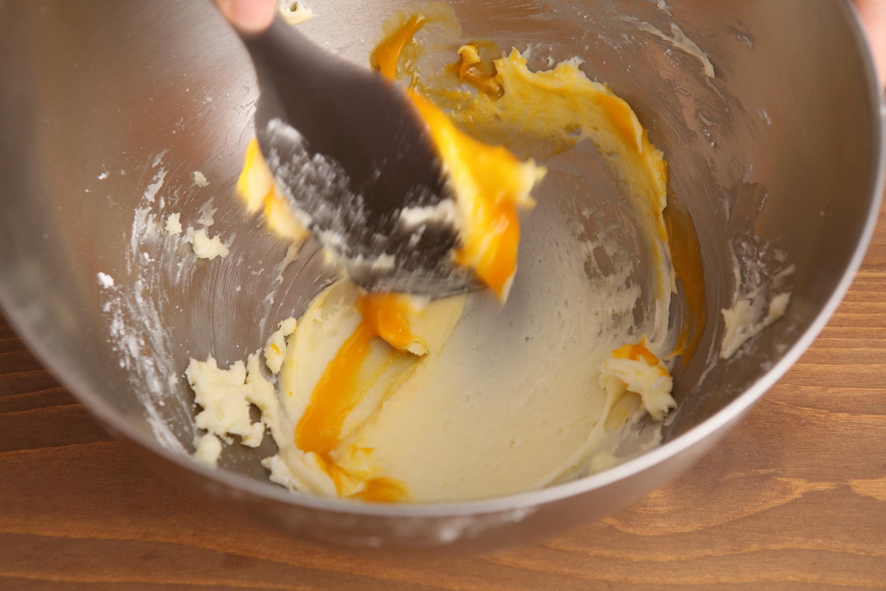 卵黄を加え、黄色い筋が見えなくなるまで混ぜる合わせる。バニラオイルと塩を加えて混ぜる。