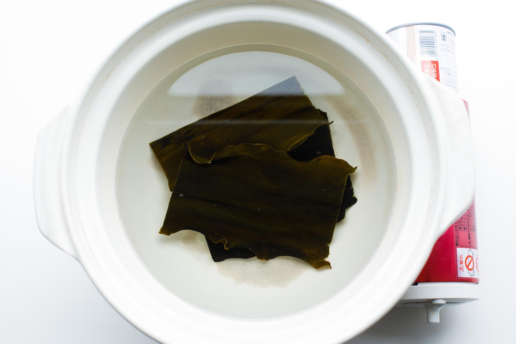昆布は湿った布巾で拭くか、ざっと水で洗って表面の汚れを落とし、水を張った鍋に入れて火をつける。沸騰する直前に火を止め、昆布を取り出す。
