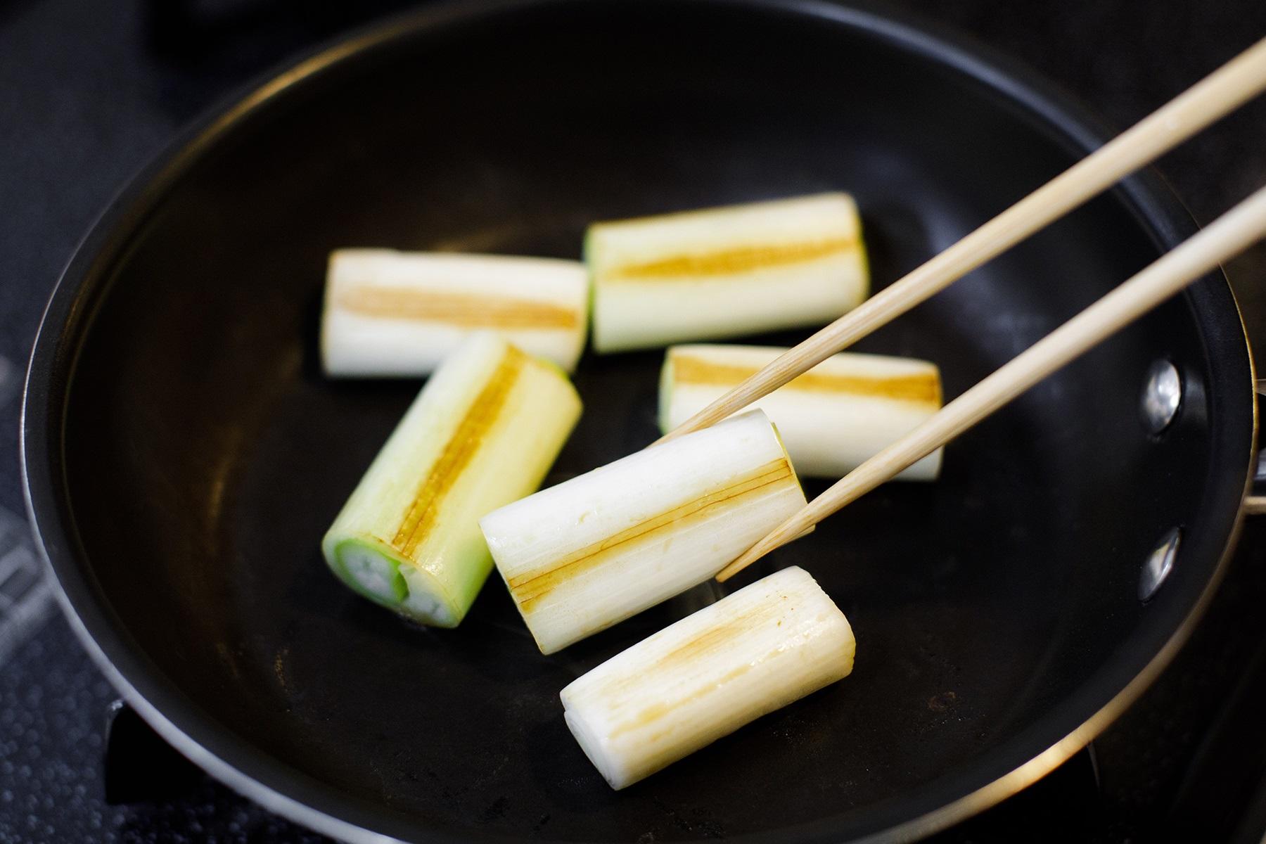 長ねぎを6cm程度に切り、フライパンで焦げ目がつくまで焼く。焦げ目の風味が大事なので、油は敷かずに焼くこと。