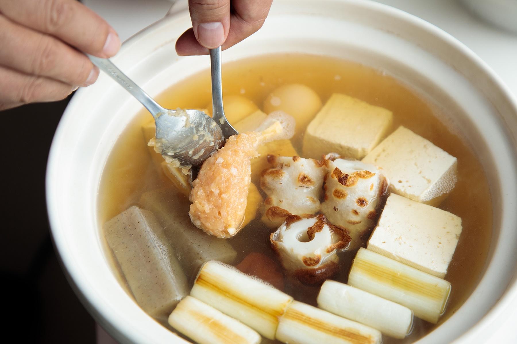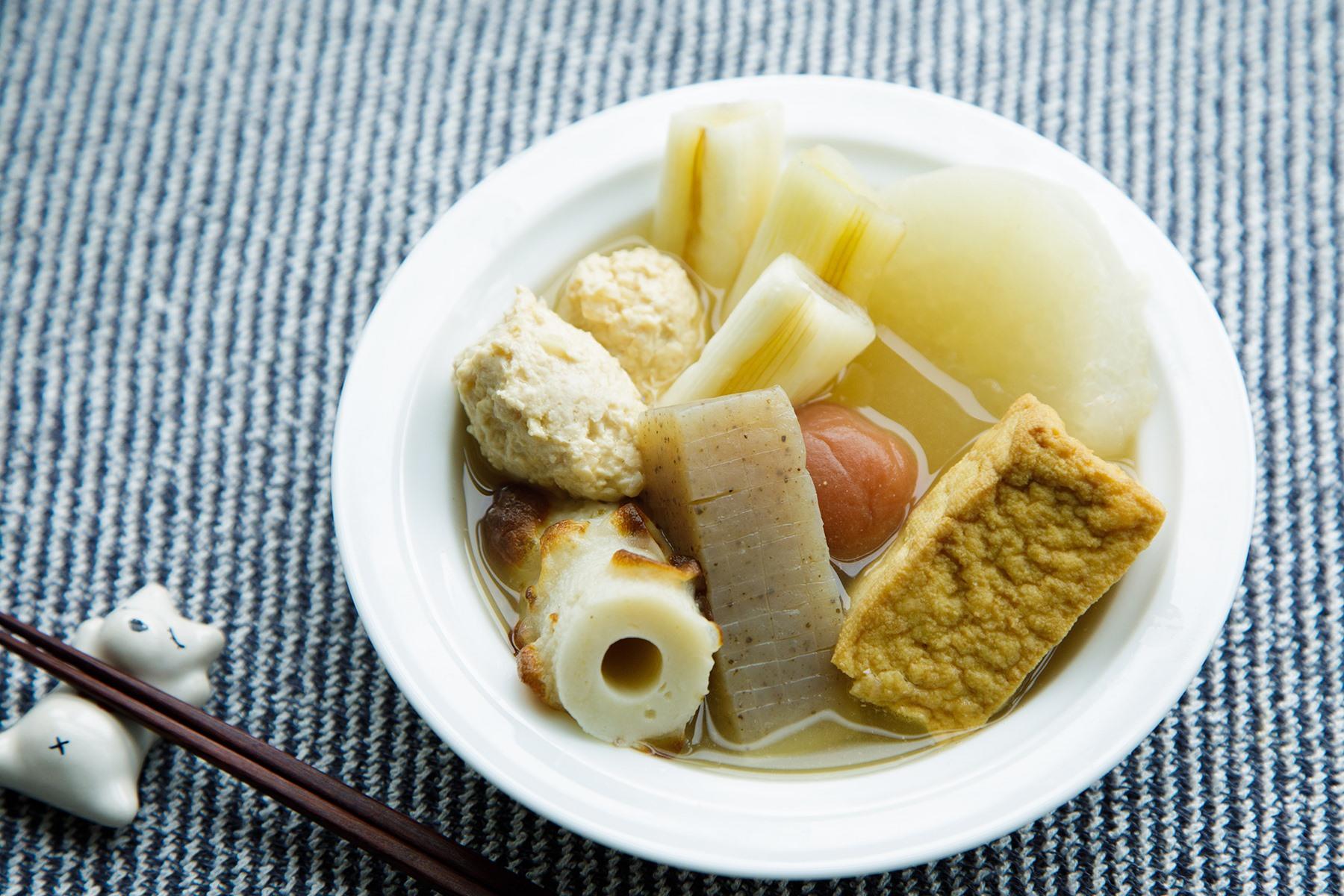 最初から煮込む具材を、基本のだしに入れて煮込んで完成。火が通りやすく煮崩れやすいはんぺんは、最後に入れる。油が出る練り物は、つゆが濁るので、後から入れよう。
