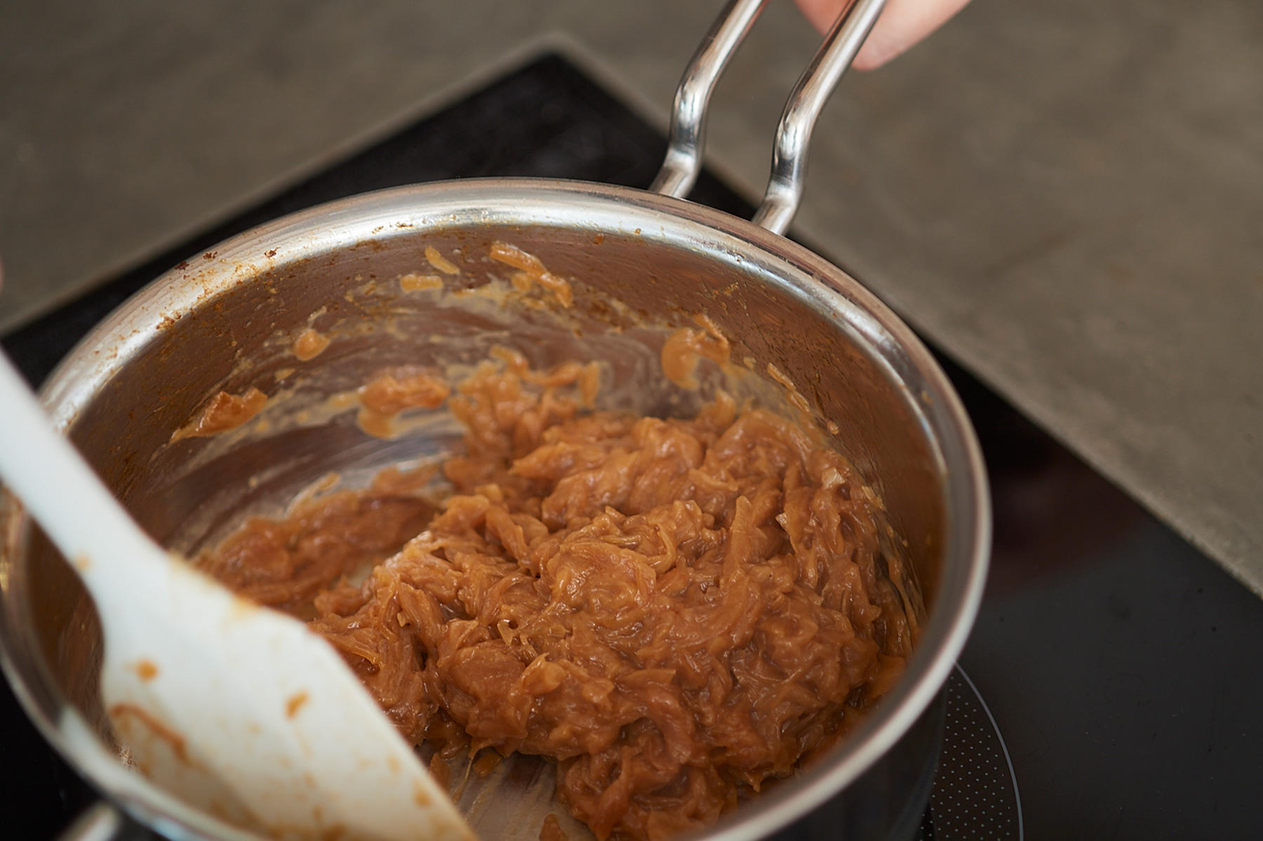 まずは、玉ねぎの炒め方です。玉ねぎの水分がなくなって、少し焦げ付くぐらいまで炒めてから、少量の水を加えること。この水が鍋肌に付いた焦げをゆるめ、玉ねぎ全体を色づけるエキスになります。じっくり火を入れる、水を足して焦げを全体に馴染ませるというくり返しで、色と旨味を深めていくことができるのです。
