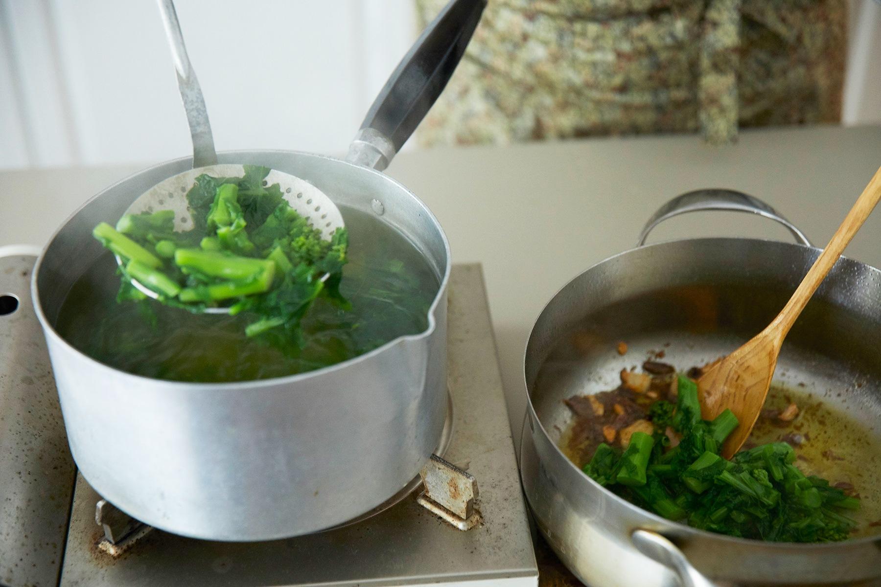菜の花のような苦味のある野菜は、オイルとの相性が抜群。洋風料理に使ってみると、新しい発見があります。くたくたに煮た菜の花のソースでつくるオレキエッテをつくってみましょう。