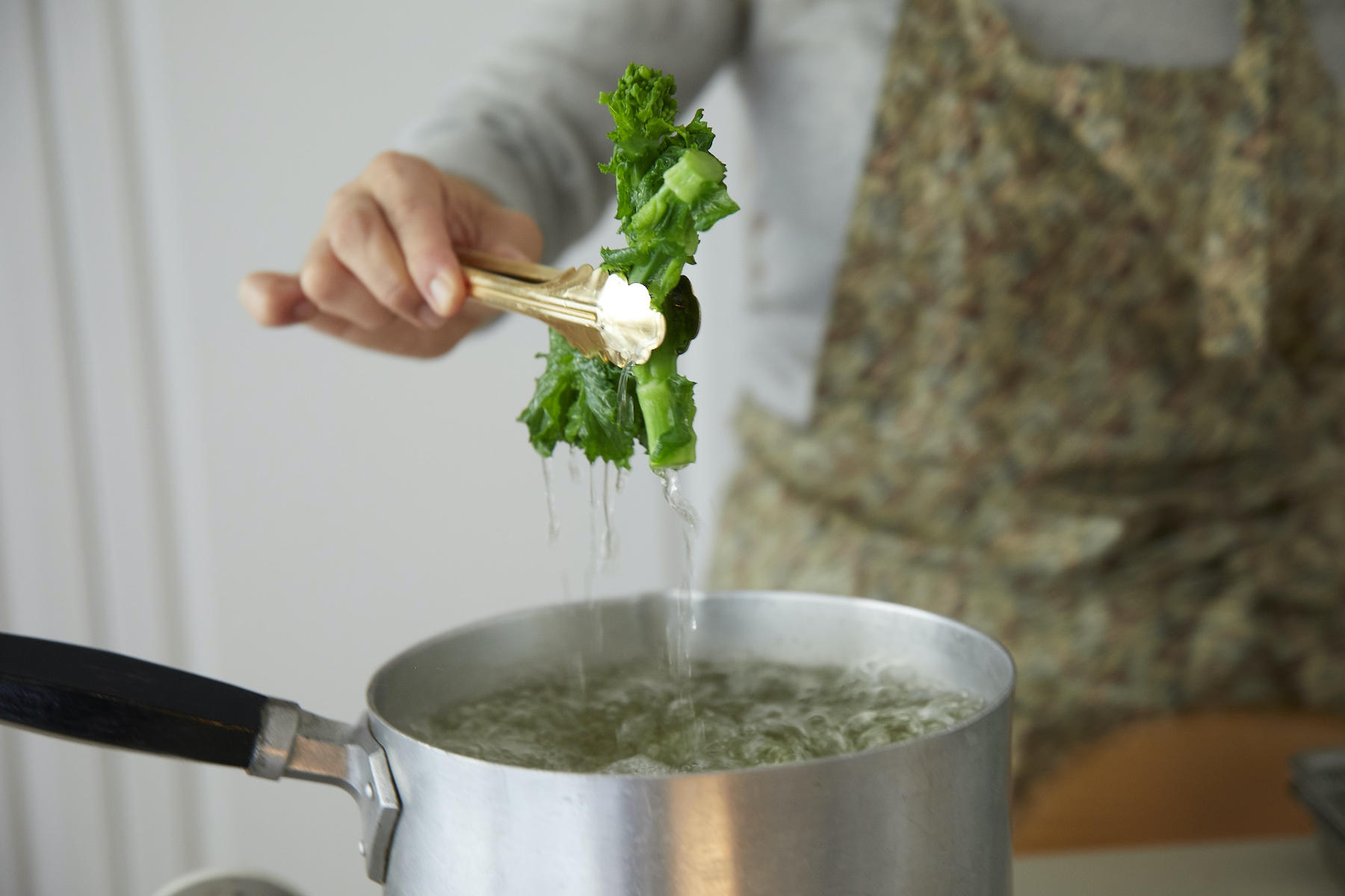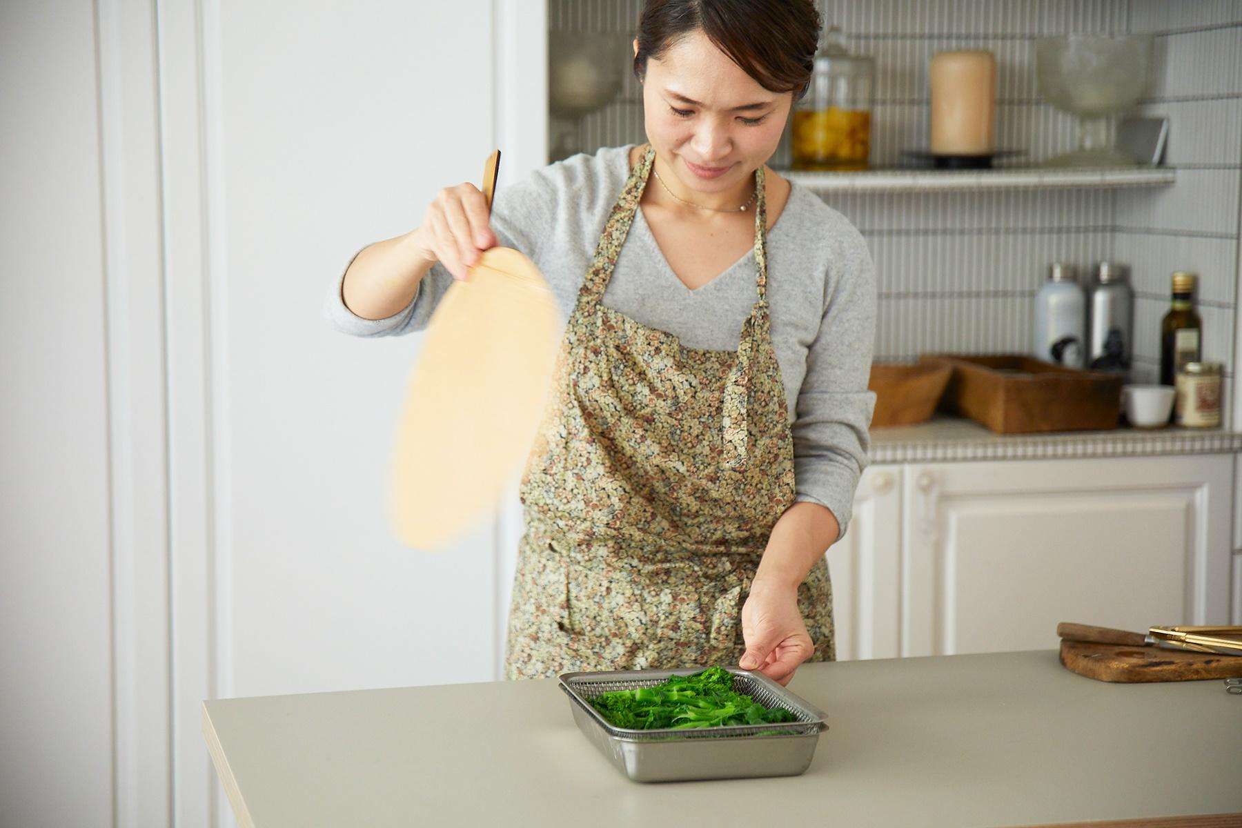 陸あげとは、ゆでた野菜をざるに広げて自然に冷ますこと。水にとって冷ました野菜は水っぽく、味わいがうすく感じられます。日持ちはしますが、香りや個性が弱まるので菜の花の苦味を大切にしたいのであれば陸上げをおすすめします。