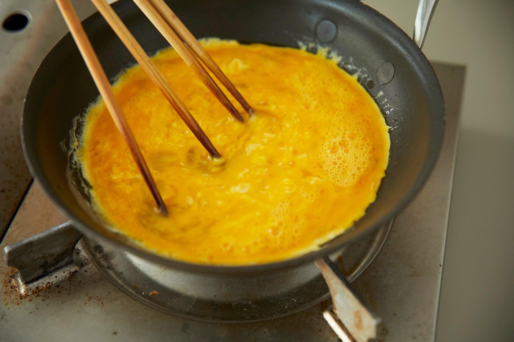 油を弱火で熱したフライパンに卵を加え、箸4本で混ぜながら細かい炒り卵をつくる。
