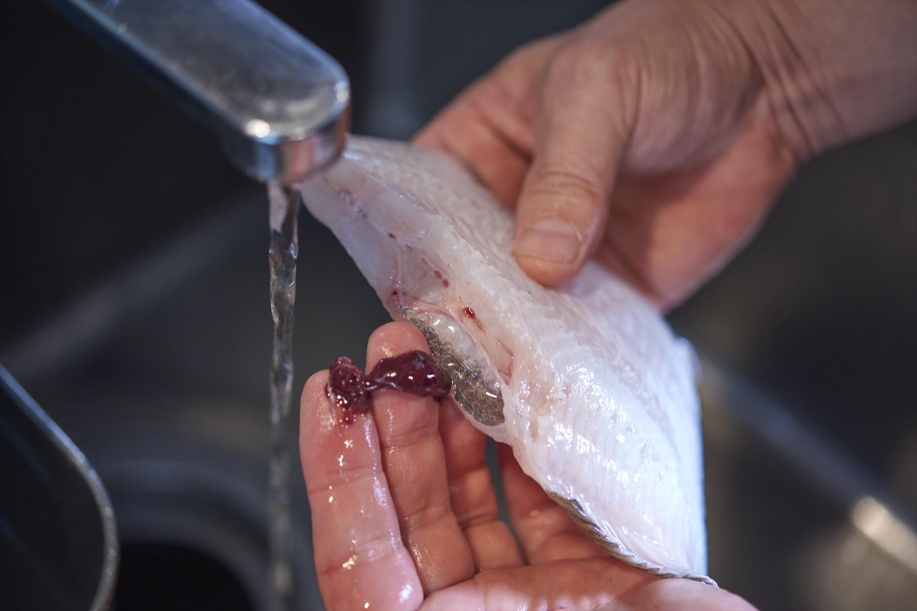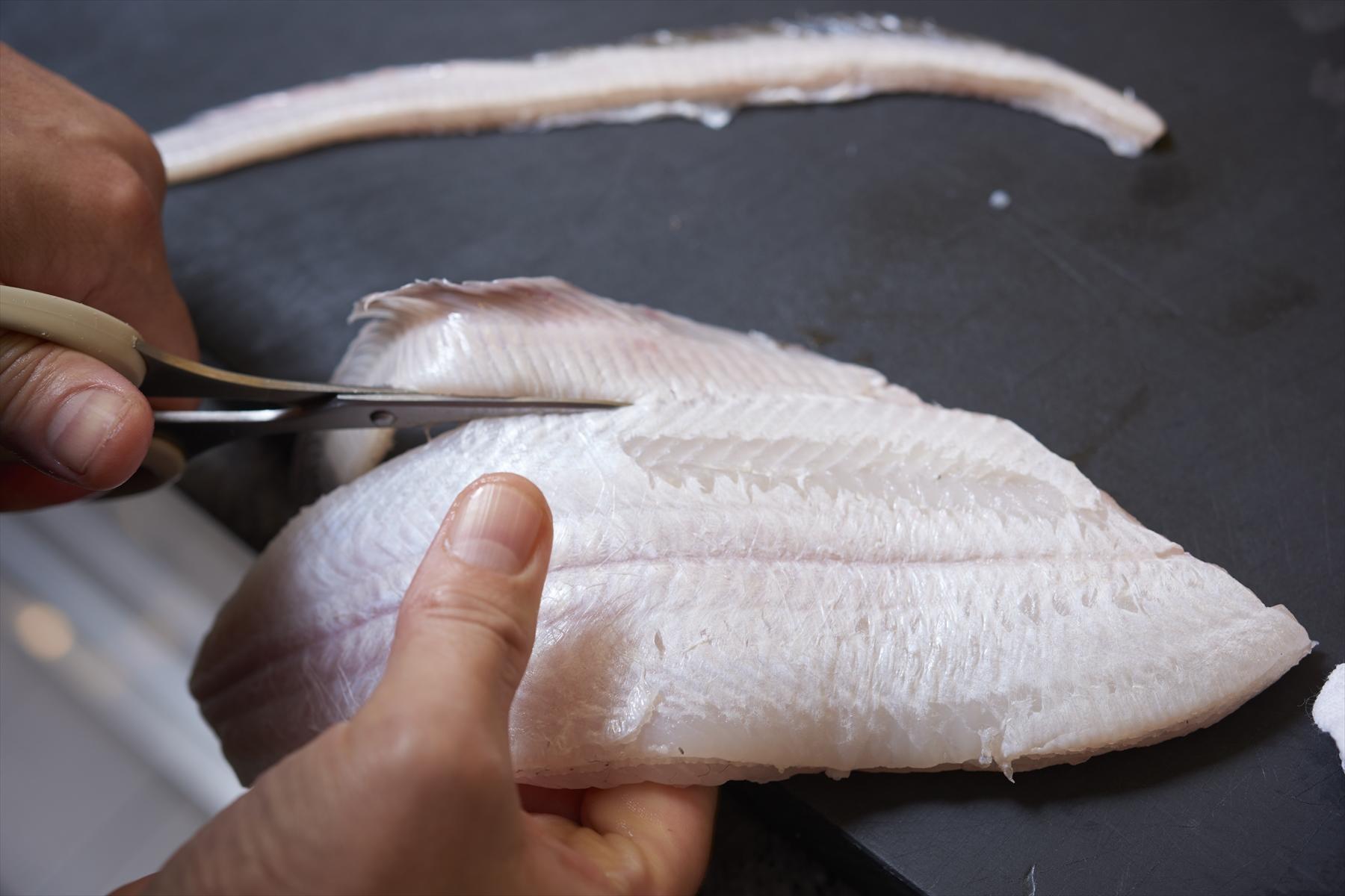 尾は先から7~8cmのところで切り落とす。流水で全体を洗い、残った内臓や血合いを除く。まわりのヒレをえんがわごと、キッチンばさみで切り取る。※切り落としたヒレは、魚だしなどに利用できる。切り落とした断面に出ている小骨を切り取る。
