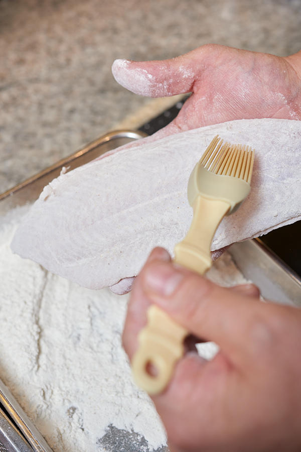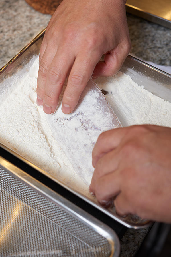 薄く均一につけるためにまず、たっぷり粉をつけて。粉のつき具合は、うっすらと身が透けるくらいがベスト。