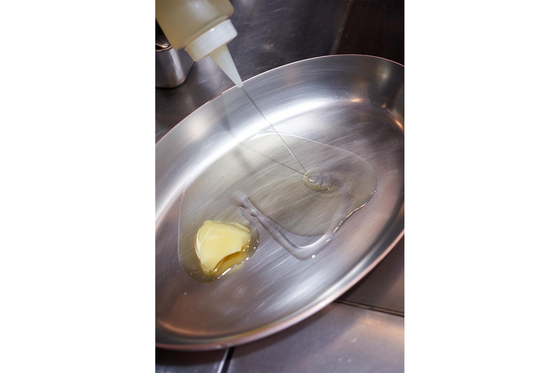 舌平目に粉をつけたら、すぐにフライパンにすましバター、胡麻油(白)を入れて弱めの中火にかける。すましバターは、ボウルにバター(無塩)を入れ、湯煎でゆっくりと溶かす。そのまま粗熱がとれるまでおき、表面に浮いたアクを除き、下にたまった乳漿を入れないようにしてキッチンペーパーを敷いたザルでこしてつくる。
