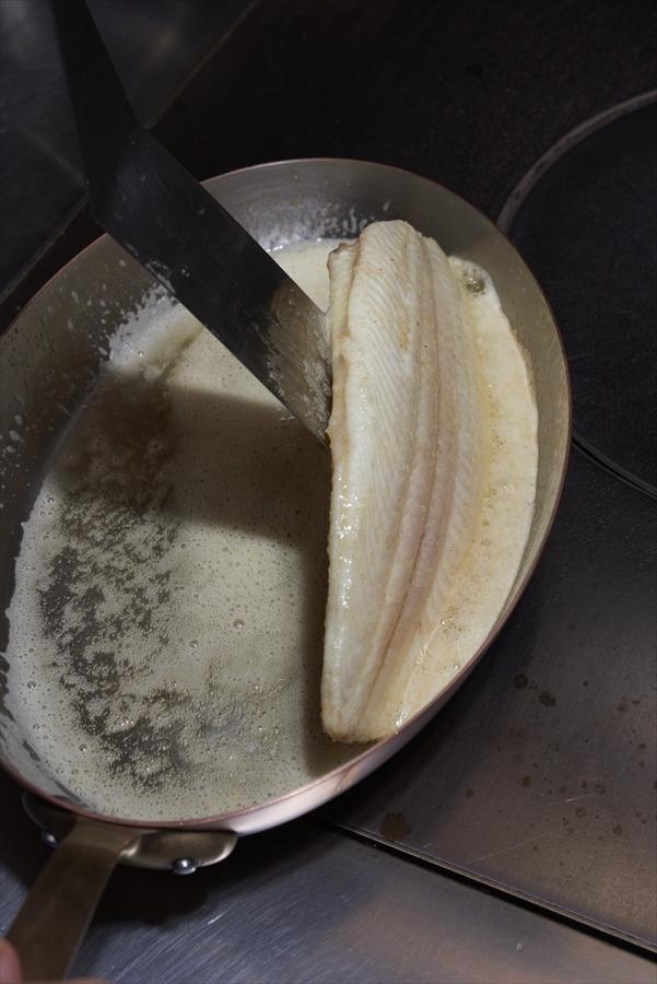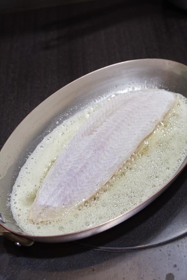 すましバターが溶けたら、発酵バター大さじ1と1/2を加える。溶けて細かく泡立ってきたら、舌平目を表側を下にして、身の厚い頭側から入れる。すましバター、胡麻油(白)、発酵バターの分量は、舌平目の厚みの1/4が油脂につかる状態が理想。フライパンの大きさや形状、魚の厚みによって、焼く際に油脂の量を調整する。焦げにくくするために植物性の油を併用するが、胡麻油(白)を使うのは、コクはありながら、魚やバターの風味を邪魔しないため。