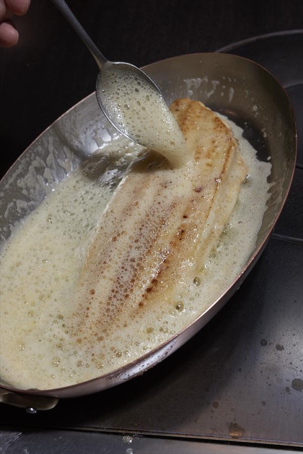 バターの泡の中で舌平目を焼くイメージで。アロゼでバターの風味を魚に含ませ、しっとり仕上げに。
