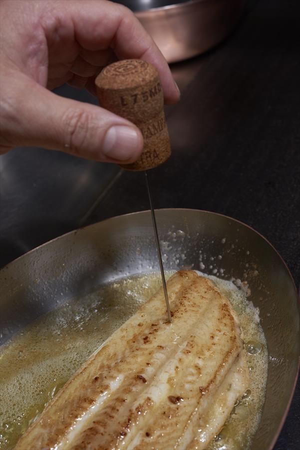 ムース状の泡が消えてきたら、その都度、発酵バター大さじ1を加え、スプーンで泡をかけながら焼く。フライパンを軽く揺すったり、火からはずしたりして温度を下げても。油脂の泡が少し茶色くなってきたら、身の一番厚いあたりに金串を刺し、火の通り具合をチェック