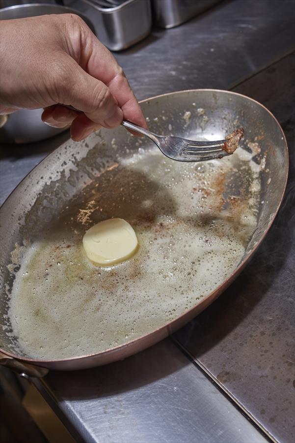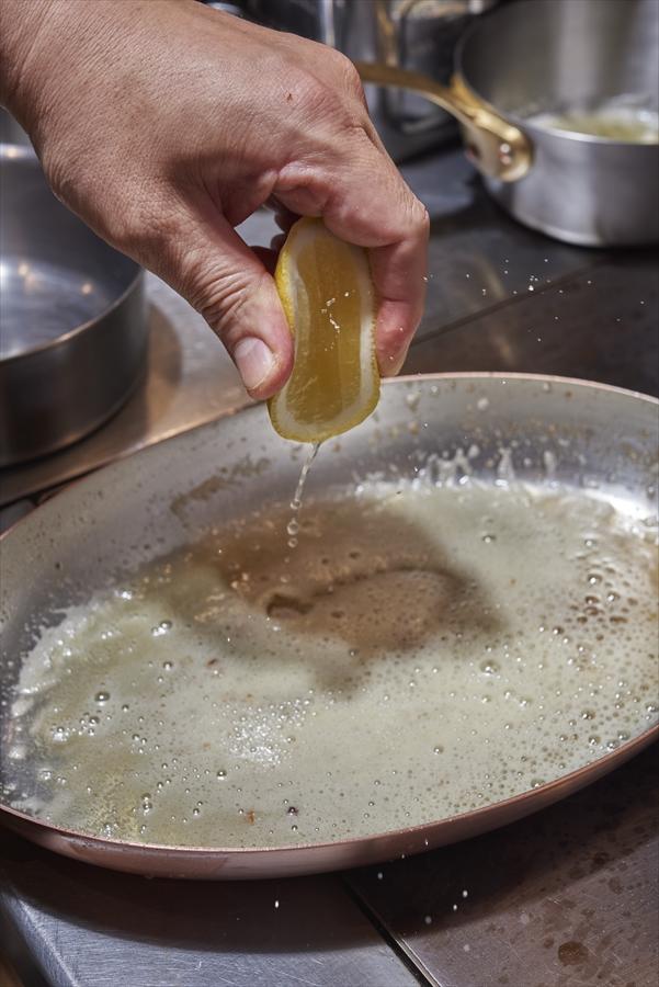 ここからは仕上げ。バターを焦がしてソースに。最後のレモンのひと搾りが味をグッと引き締める。