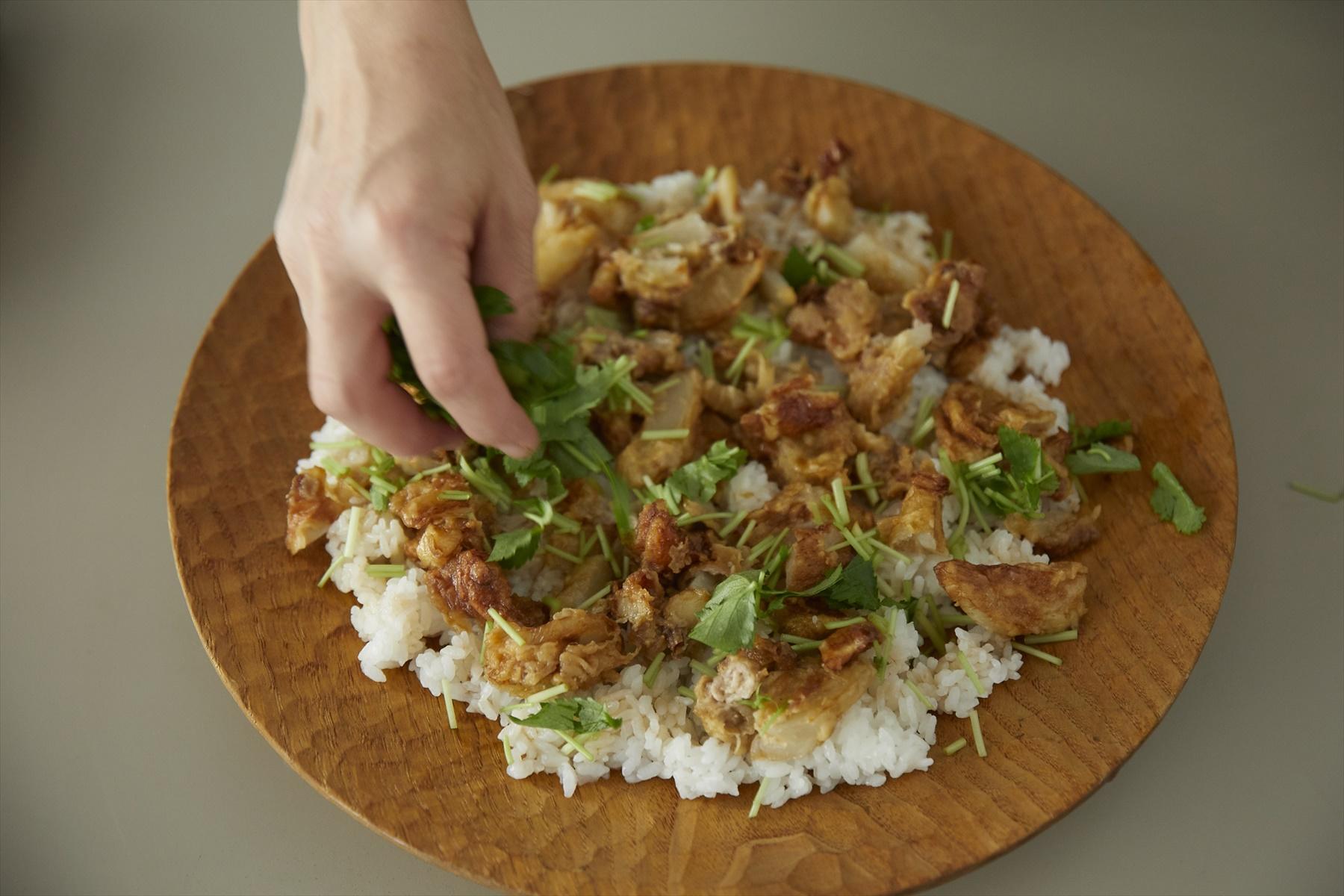 炊きたてのごはんを大きめの皿に半量強、平たく盛り付ける。5と三つ葉をそれぞれ半量強散らし、さらに残りのごはんとかき揚げ、三つ葉を同様に散らす。煮詰めためんつゆを全体に回しかけて、でき上がり。