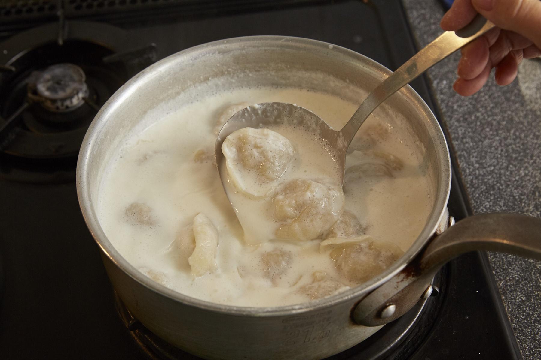 今回はその餃子の伝播に大きくかかわったとされるモンゴルの餃子、バンシーのつくり方をご紹介しましょう。モンゴルでは羊肉が主流なので肉はもちろん羊肉。水が貴重品で、家畜の乳のほうが身近だったため、日常のバンシーは羊乳で煮たものが一般的だったそうですが、今回はそれに近づけて牛乳で煮たレシピをご紹介します。