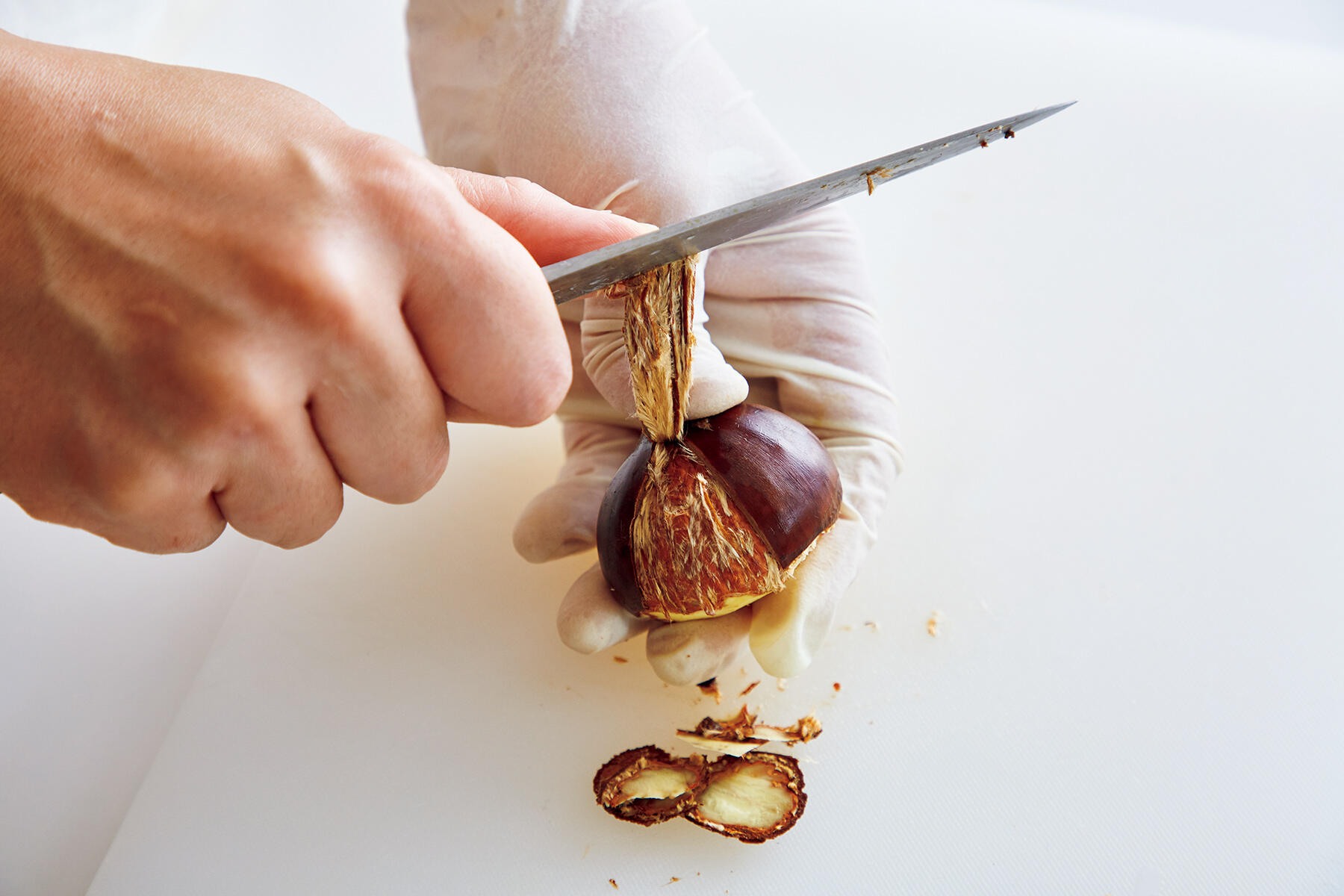 お湯につけておいた栗のおしりのかたい部分を切り落とす。切り落とした部分から、包丁にひっかけるようにして鬼皮をはがす。鬼皮を取ったら、渋皮を包丁でむいていく。全体的に力がいるので手を切らないよう注意。
