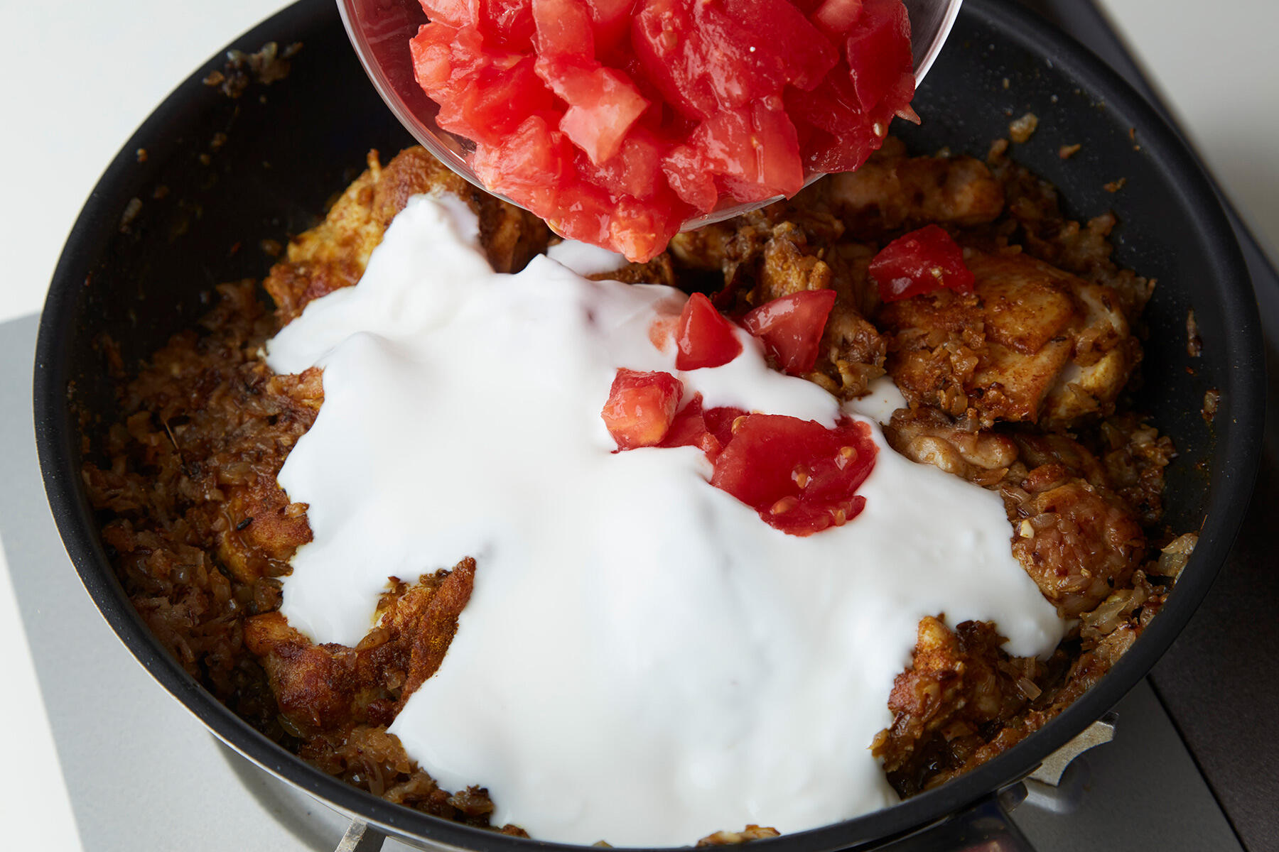 ヨーグルト、トマト、ローリエ、塩、カイエンペッパーを加えて混ぜ、煮立ってきたら、火を弱めて蓋をして、途中上下を混ぜながら煮る。