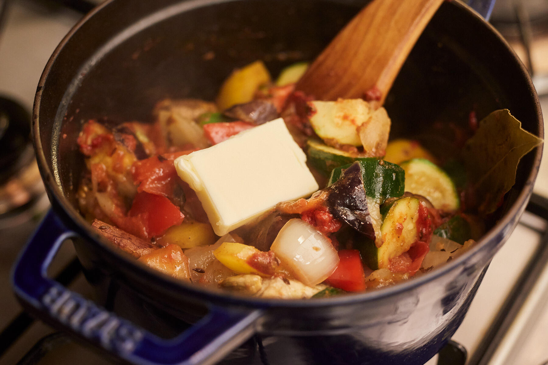 夏野菜のもつ水分だけで煮込むから、野菜のおいしさがギュッと詰まって自然な甘味。