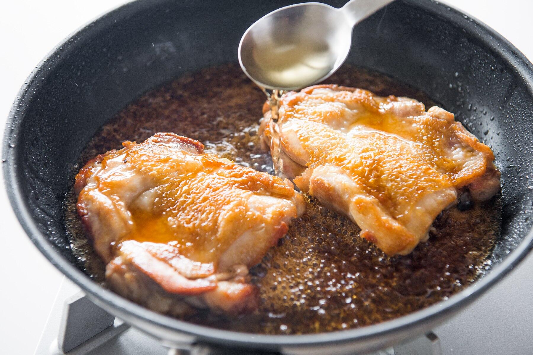 酒をふり入れ、たれの材料を加えて混ぜ、鶏肉にスプーンでたれをかけながら弱火で煮詰める。