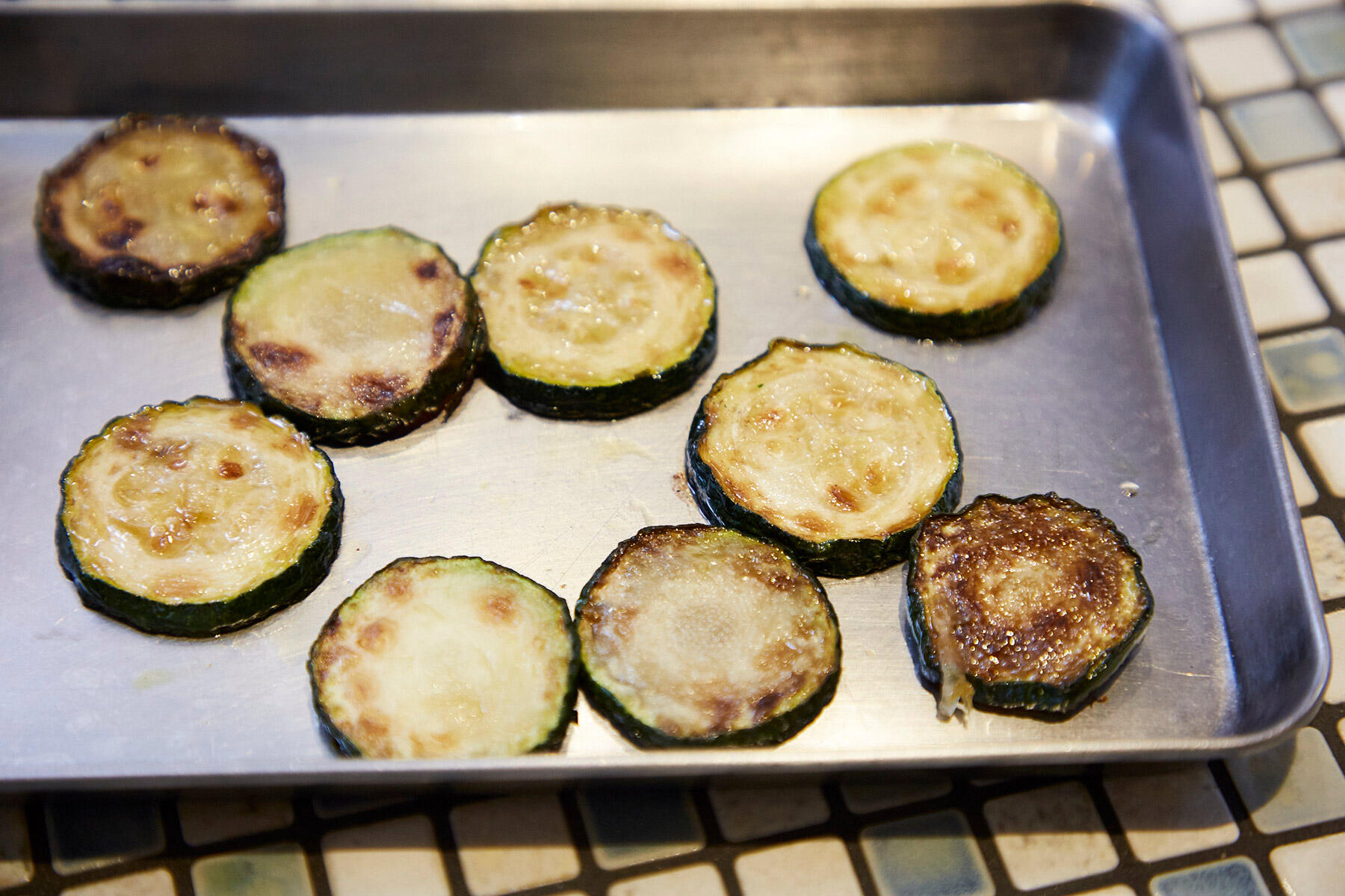 ズッキーニは厚さ8mmの輪切りにし、塩(分量外)をする。フライパンにオリーブオイル(分量外)をひき温めたら、焼き色がつくまでじっくり焼く。