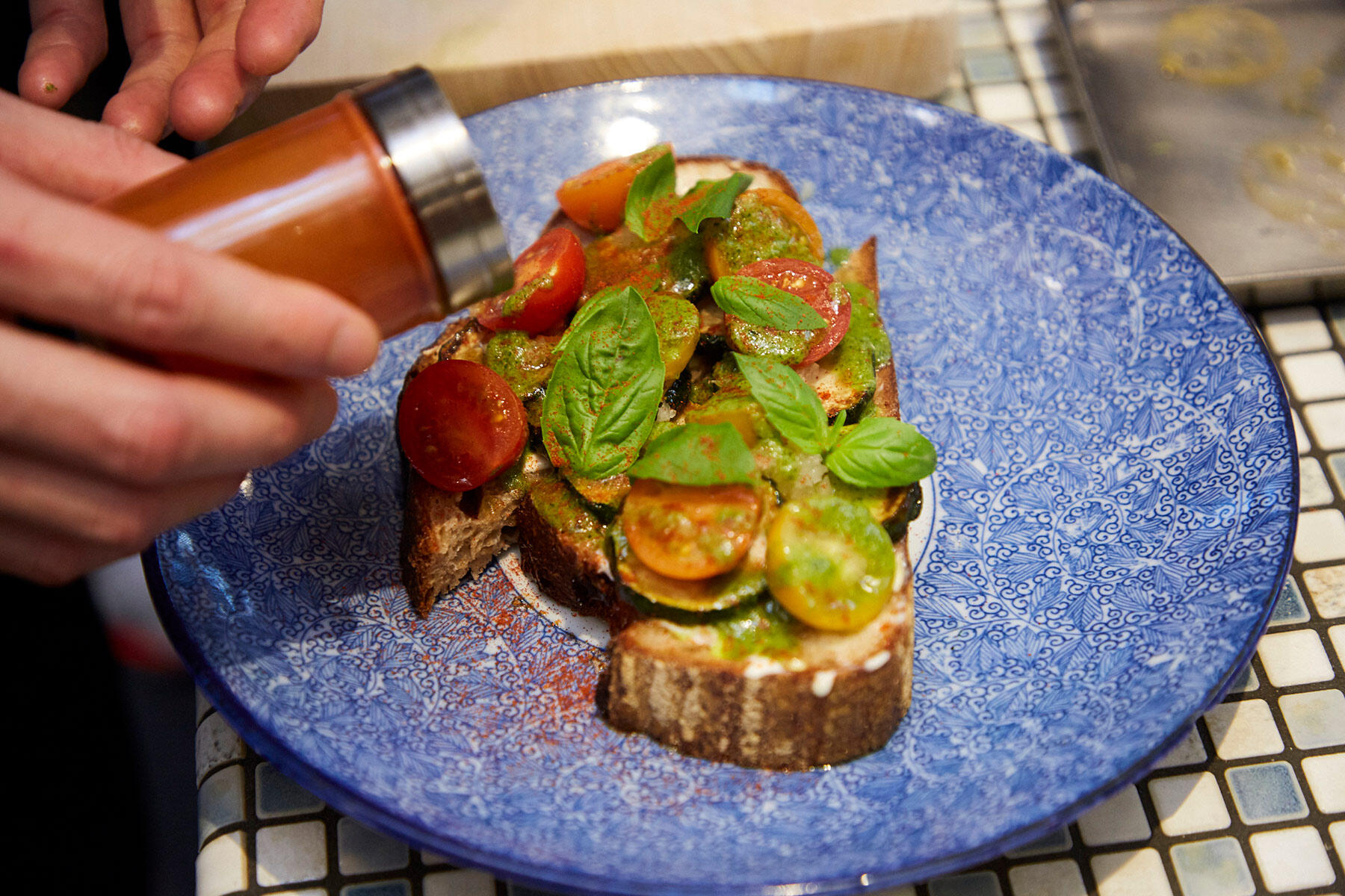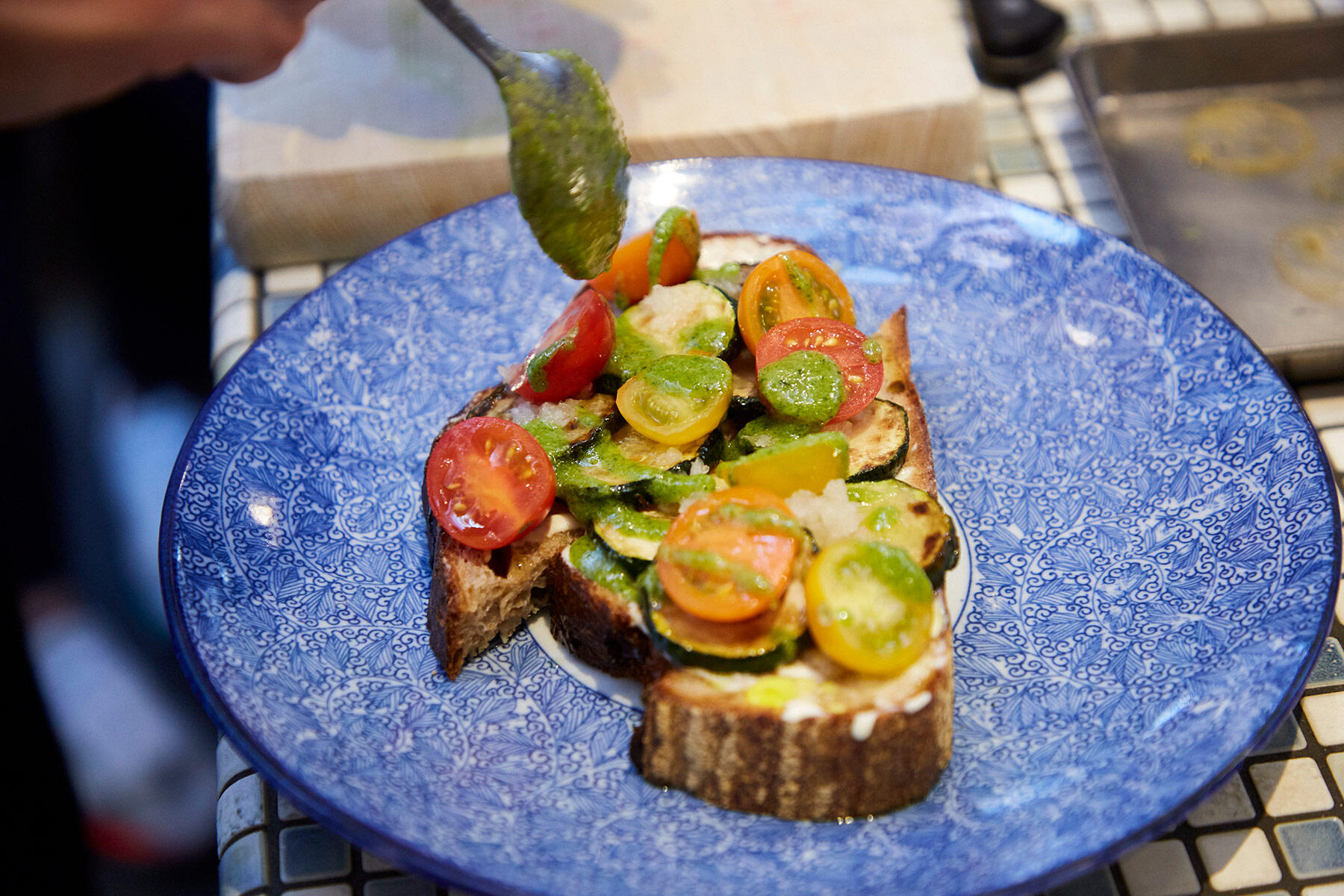 しっとりとしたズッキーニがパンに馴染んで、ジュワッとおいしさを口に広げる。にんにくやエシャロットの入ったジェノヴァソースは、インパクトのある味わい。冷たい白ワインやシュワッとした泡が飲みたくなる。