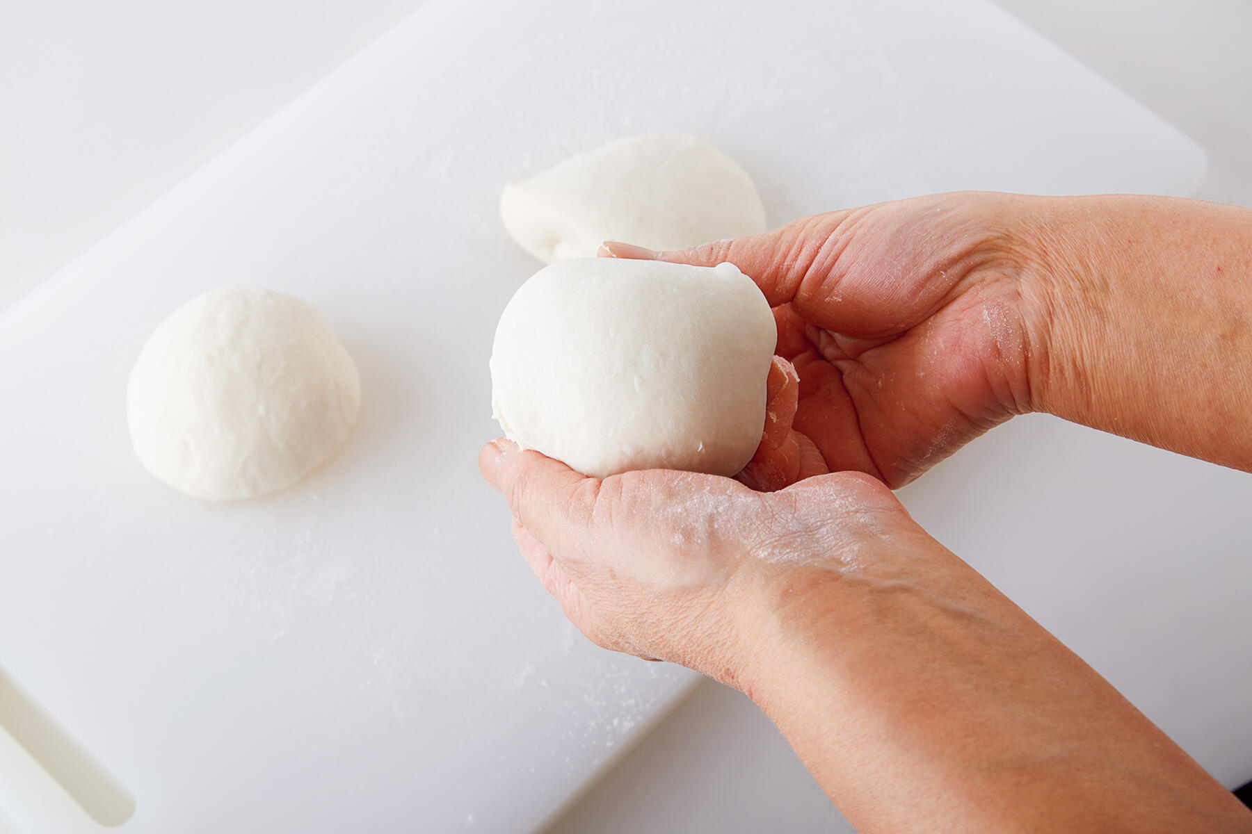 生地の中心に指を入れて空気を抜き、ひとまとめにしてから、打ち粉をしたまな板に生地を置いて3等分に切り、丸く形づくる。