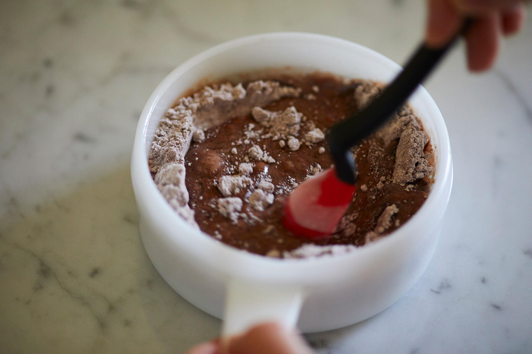 水を加え、スプーン、または小さめのゴムべラでなめらかになるまで混ぜる。粉が飛び散らないよう、中心から円を描きながら静かに混ぜるのがコツ。