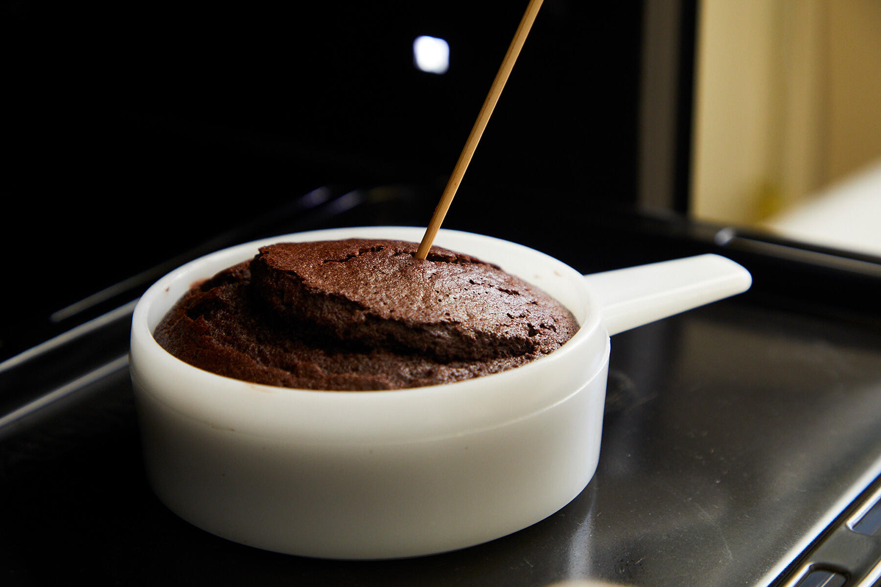 180℃のオーブンで約20分焼く。串をさして生の生地がつかなければ焼き上がり。好みでアイスクリームを添えて食べる。