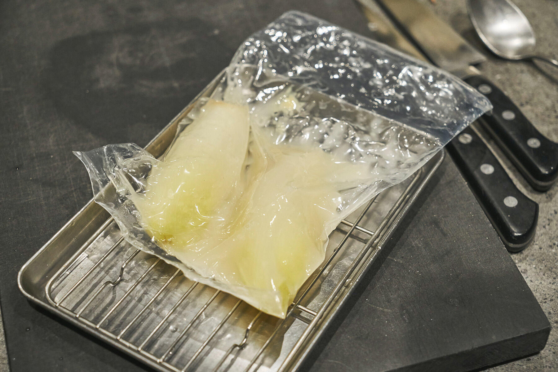 真空パック用の袋にガーゼを外した1のアンディーブ、コンフィ用のbotanova“バター風味”を入れ、真空パック機にかける。