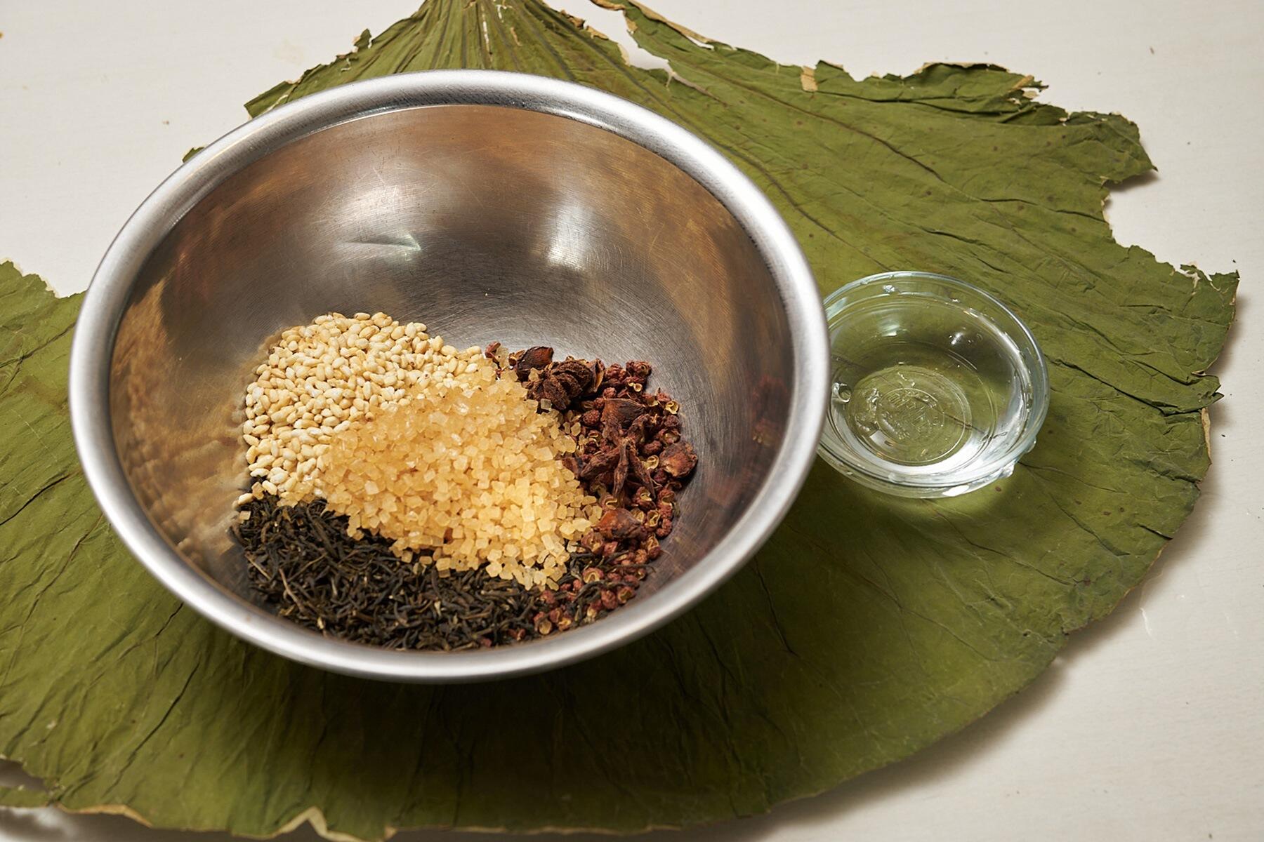 フライパンに米を入れて中火にし、ヘラでかき混ぜながら、乾煎りをする。芯までしっかり火が通るように、時々フライパンを振り、黄金色になるまでじっくり煎る。ボウルに乾煎りした米、砕いた八角、花椒、ジャスミン茶を入れ、蓮の葉をちぎりながら加える。水(分量外、適宜)を少しずつ加えて混ぜ合わせ、湿らせておく。