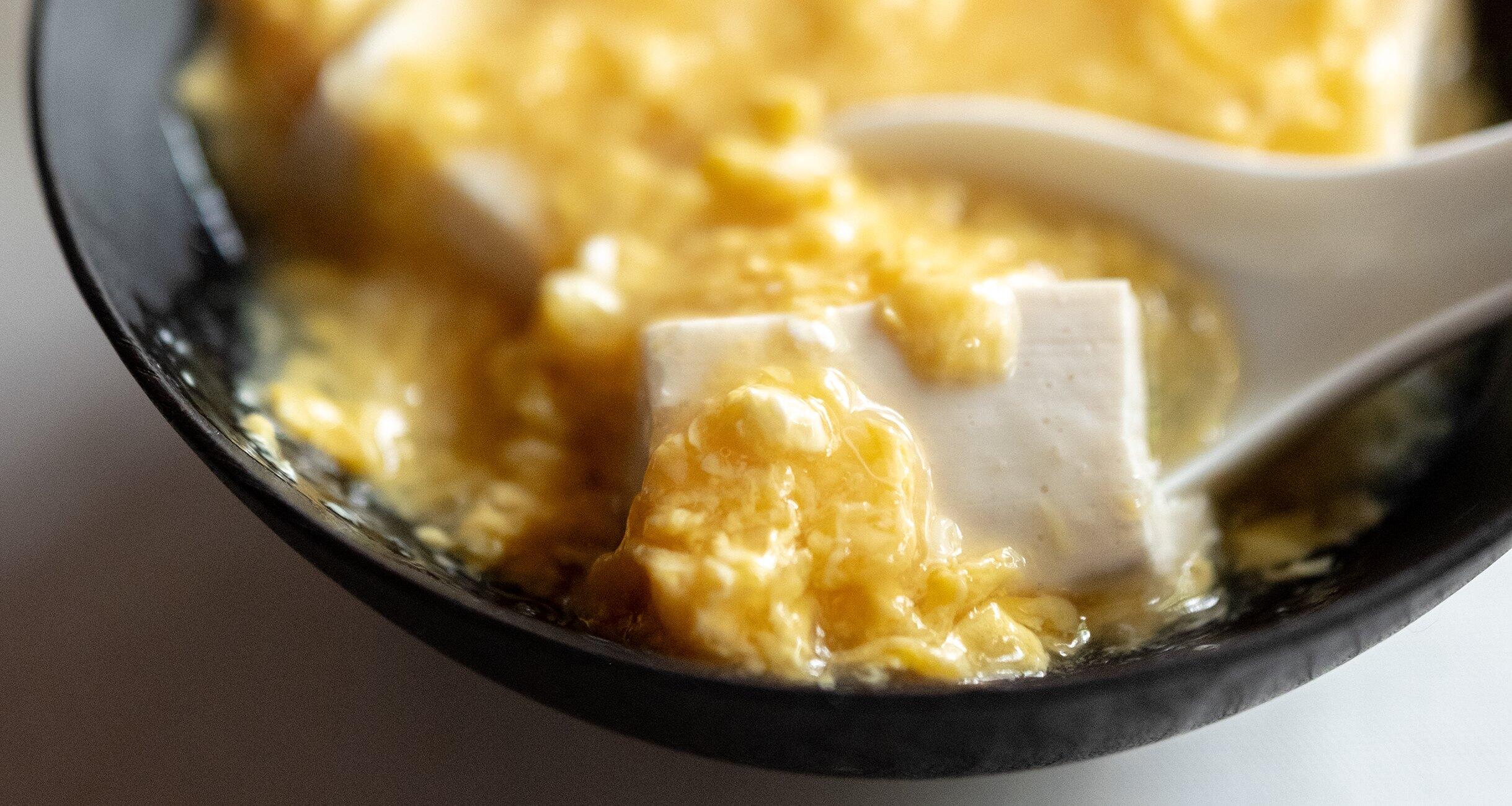【吉田】「かき玉あんかけ温やっこ」は、お椀代わりやお酒のシメにもなる優しい味わい。軽く煮立たせただしに溶き卵を細~く加えると、美しい仕上がりに。