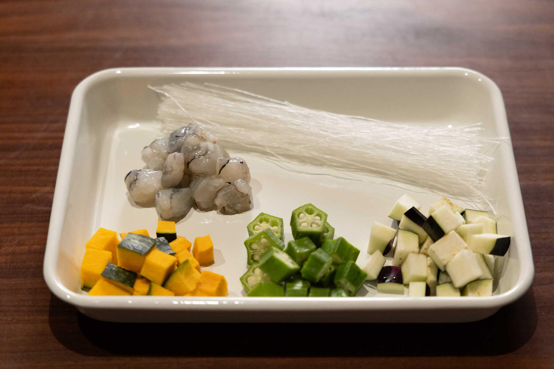 かぼちゃは1.5cm角に切る。なすは1.5cm角に切ってさっと水にさらして水気をきる。オクラはさっと水に濡らして塩少々(分量外)でもんで洗い、水気をきってヘタを切り落とし、1.5cm幅に切る。春雨はキッチンばさみで半分の長さに切る。