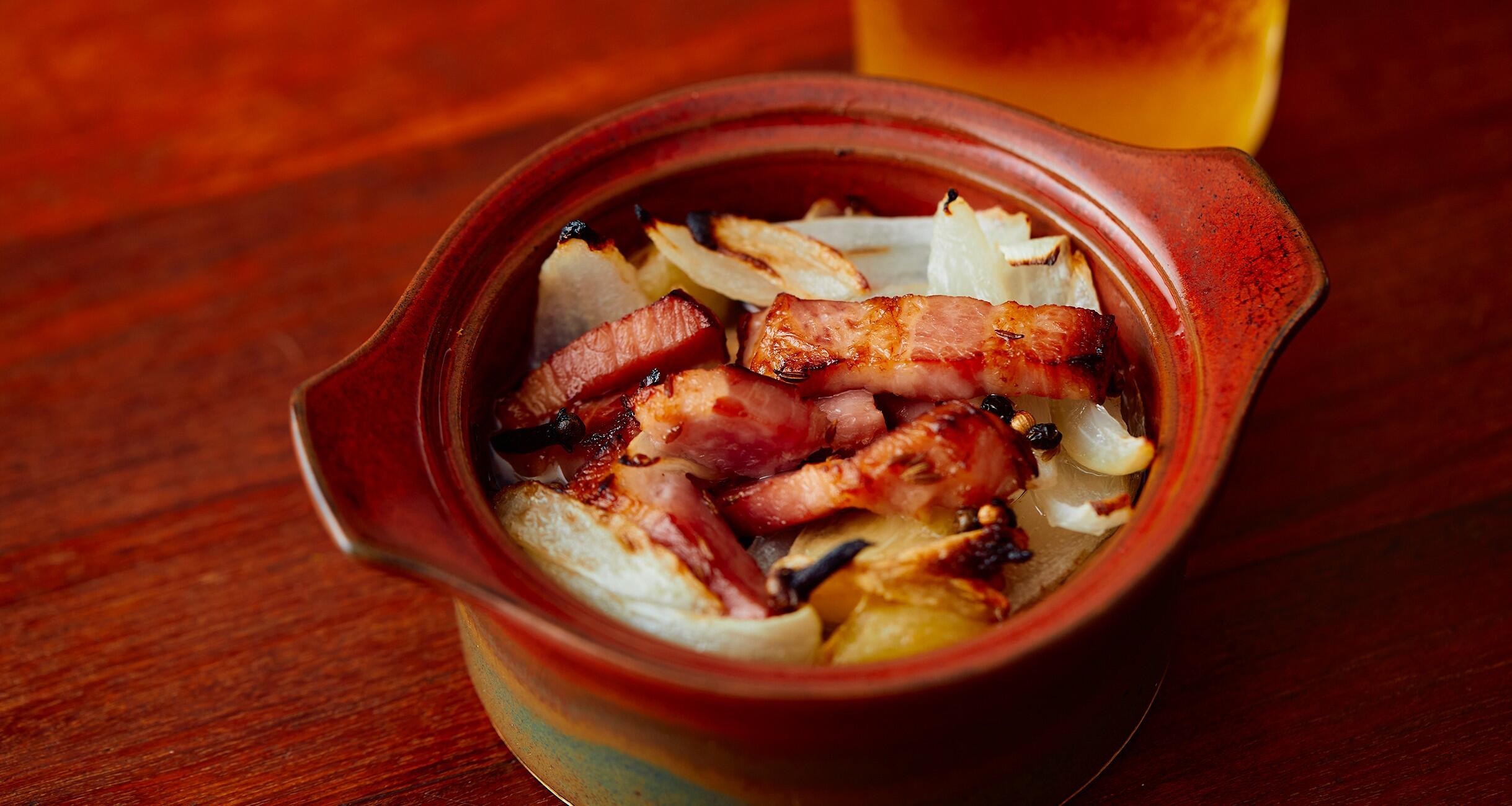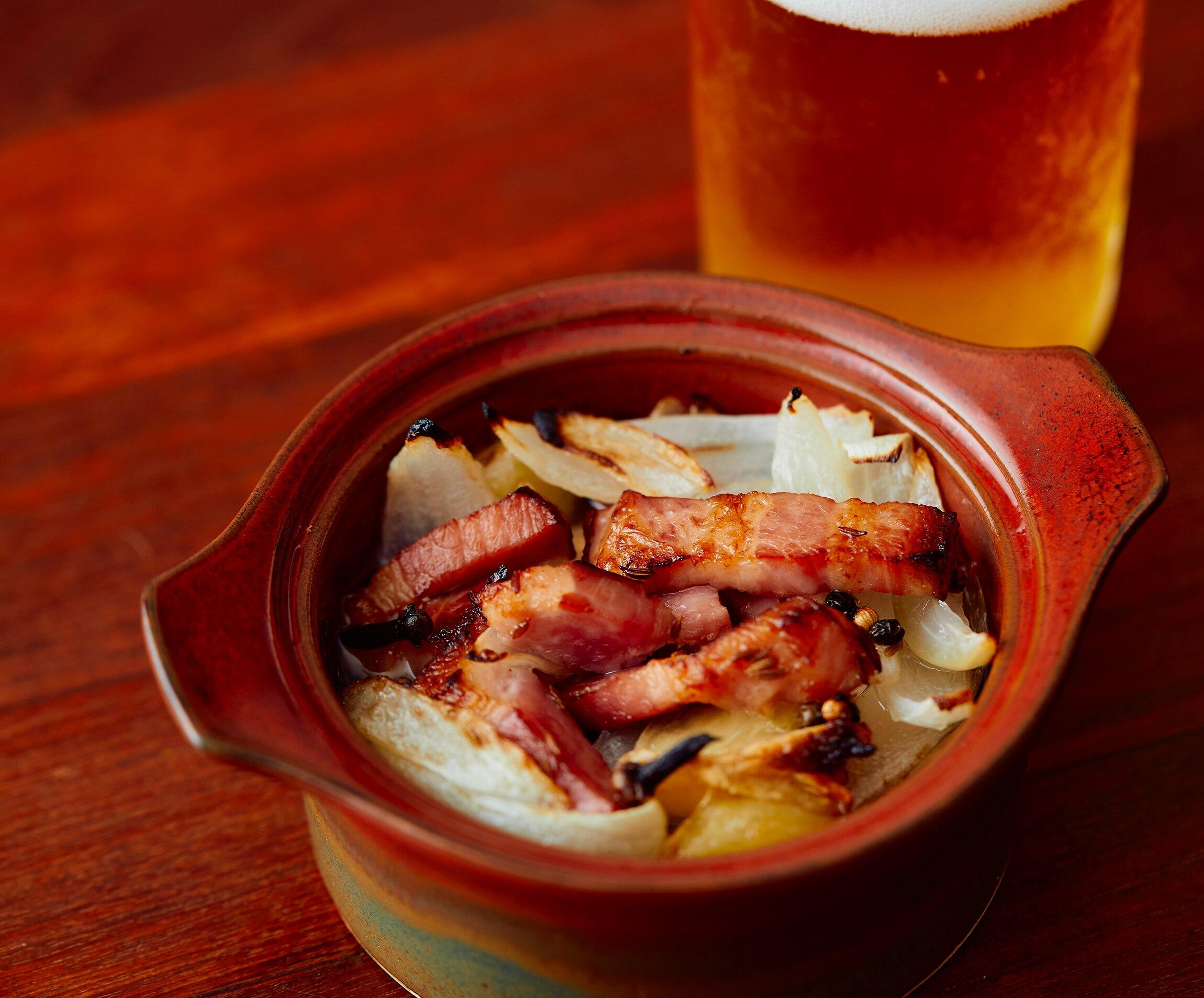 小鍋に1とAを入れてざっと混ぜ、ラードを加えて弱火にかけ、ラードを溶かす。ベーコンがカリッとして玉ねぎが透明になるまで、ときどき混ぜながら10分ほど煮る。