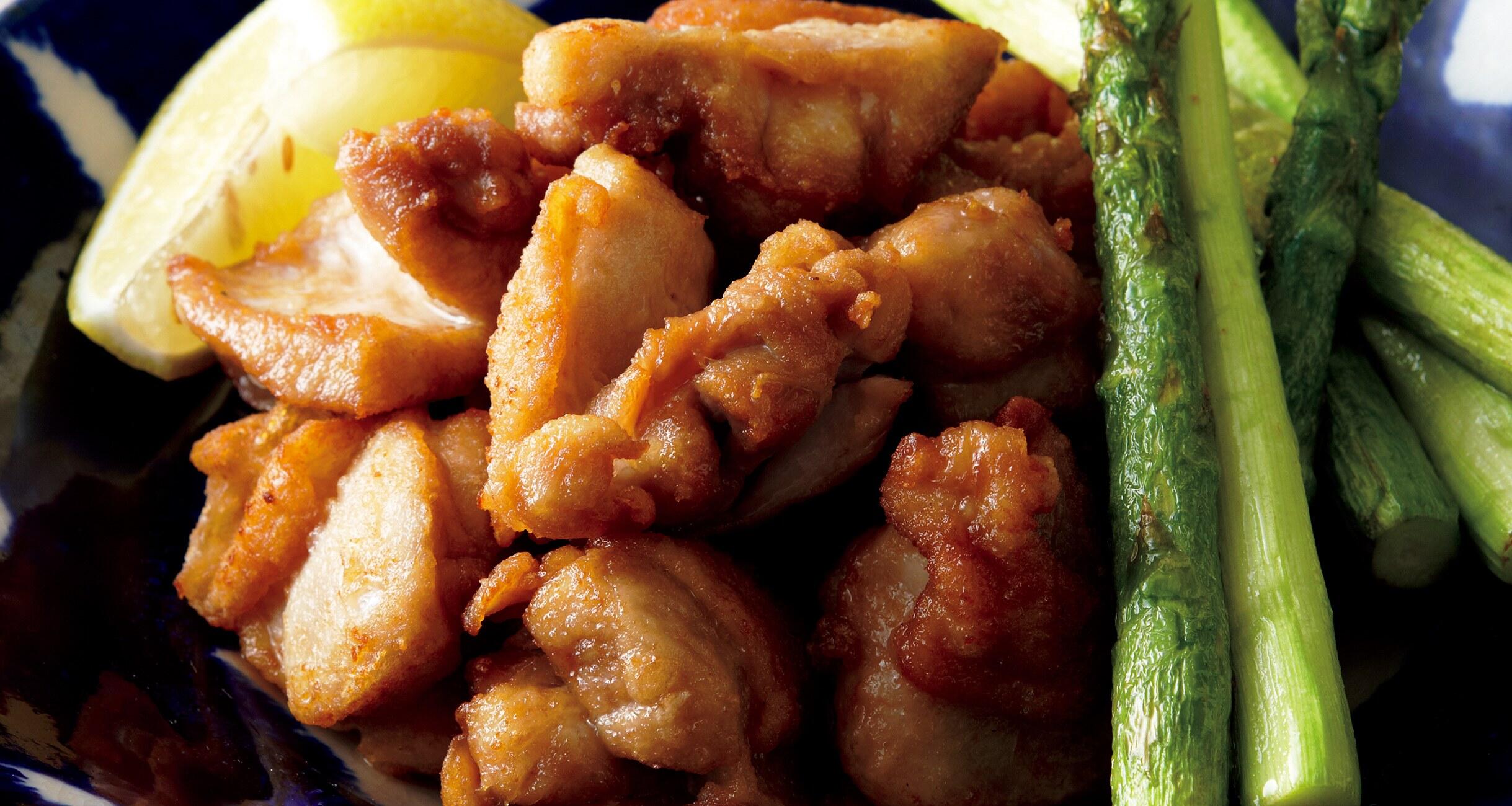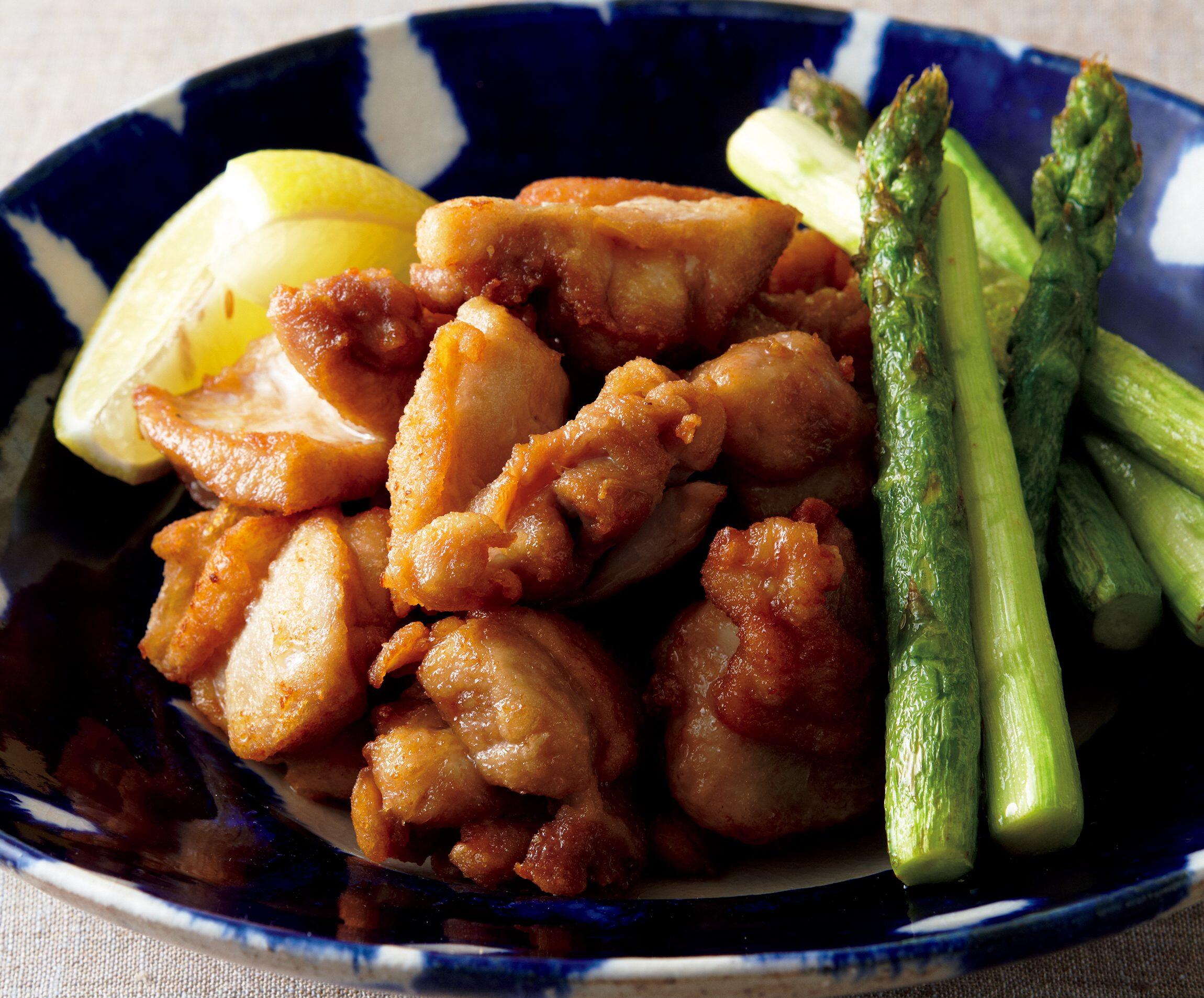 揚げ油を中温(170℃)にして鶏肉を1切れずつ入れ、途中、返しながら4~5分揚げて器に盛り、アスパラガスとレモンを添える。