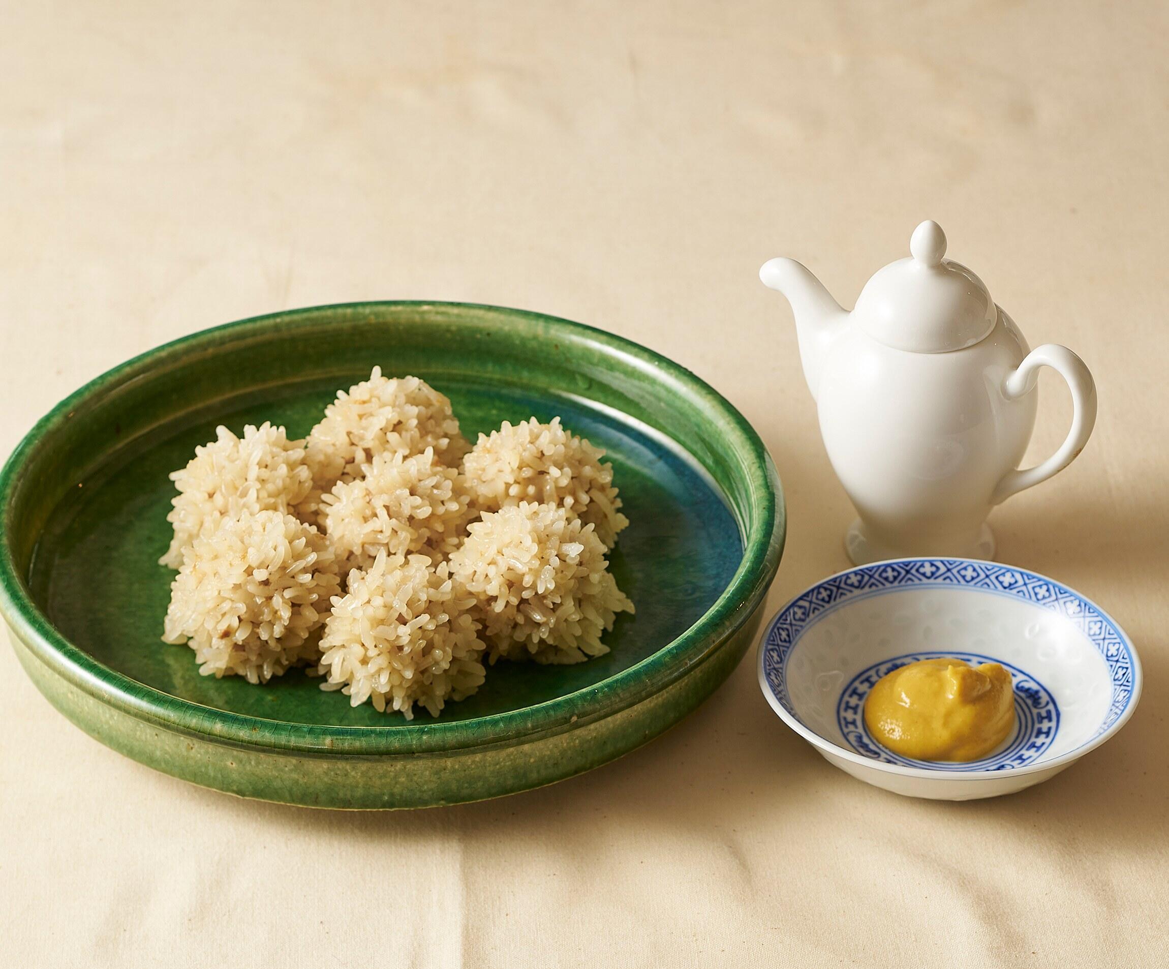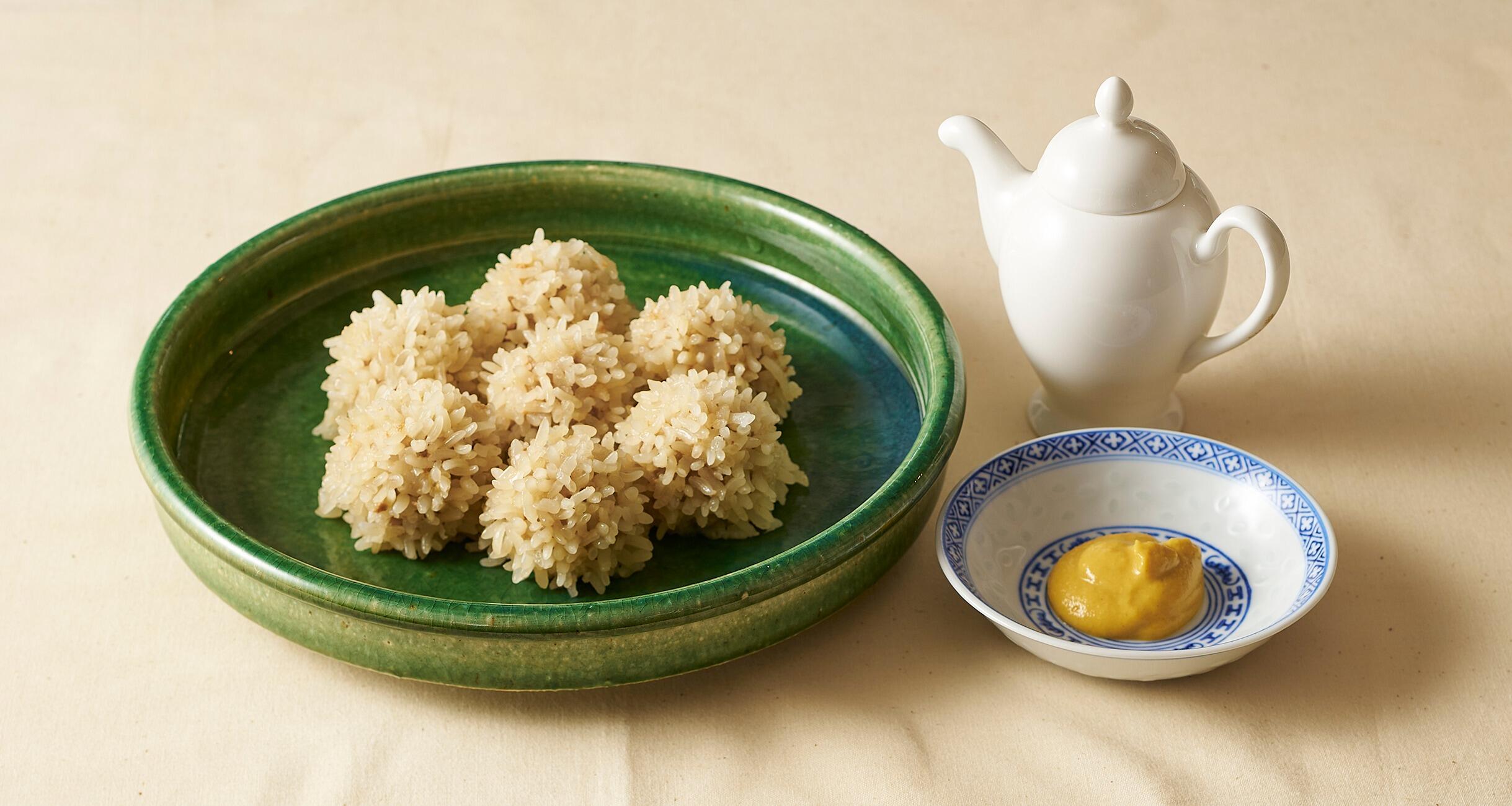蒸籠(せいろ)の蓋を開けた瞬間、白く透き通ったもち米がパッと立ち、まるで花が咲いたかのように映る。真珠の輝きを思わせることから「真珠丸子(チェンジュワンズ)」と名づけられた点心だ。本場では、真珠の別名「珍珠」を冠して「珍珠丸子」と呼ばれることが多いが、湯島聖堂のレシピ名はわかりやすく「真珠丸子」と記されている。