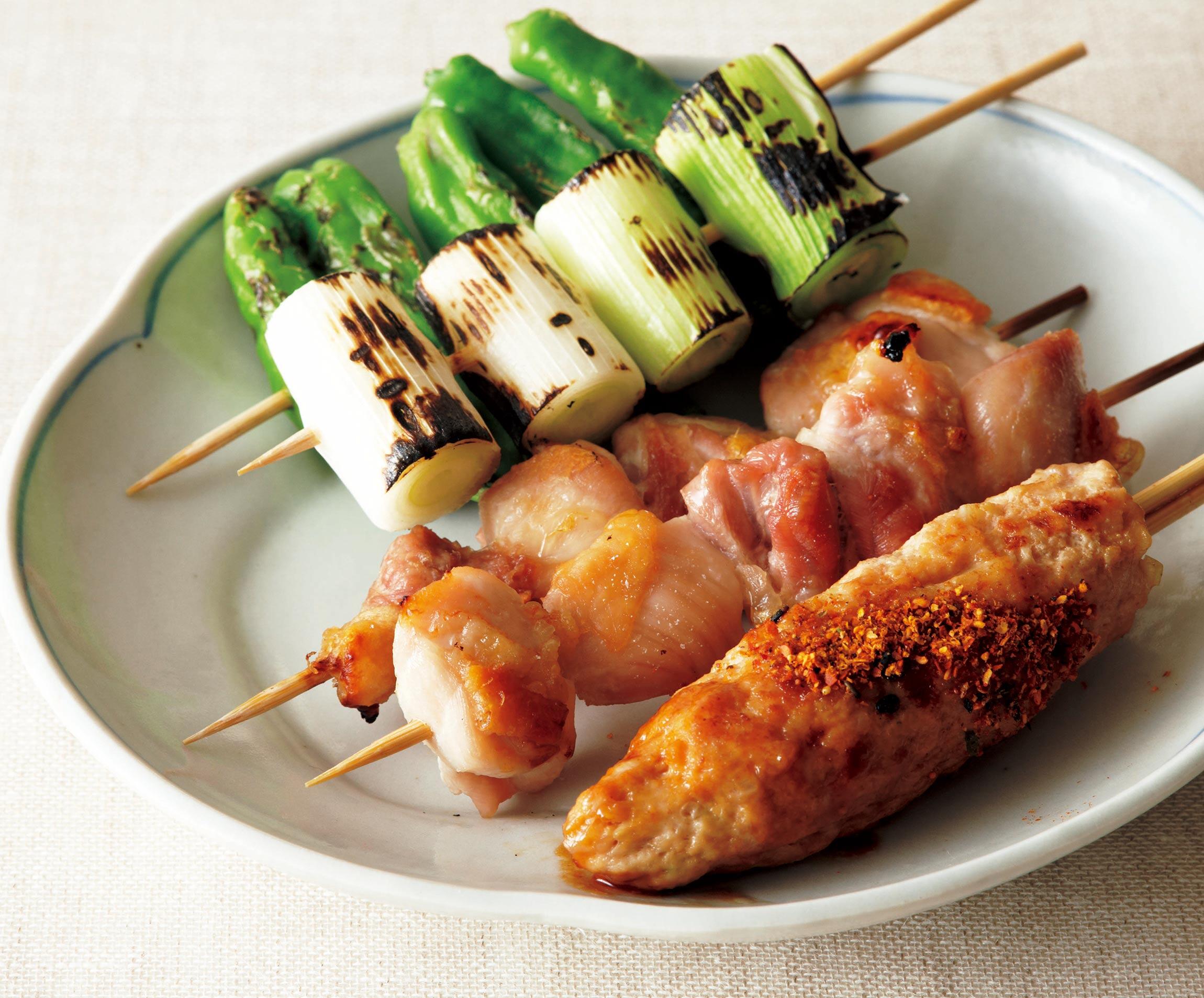 鶏肉は2.5cm角に切って竹串に刺す。長ねぎは2.5cm長さに切って竹串に刺す。しし唐も竹串に刺す。