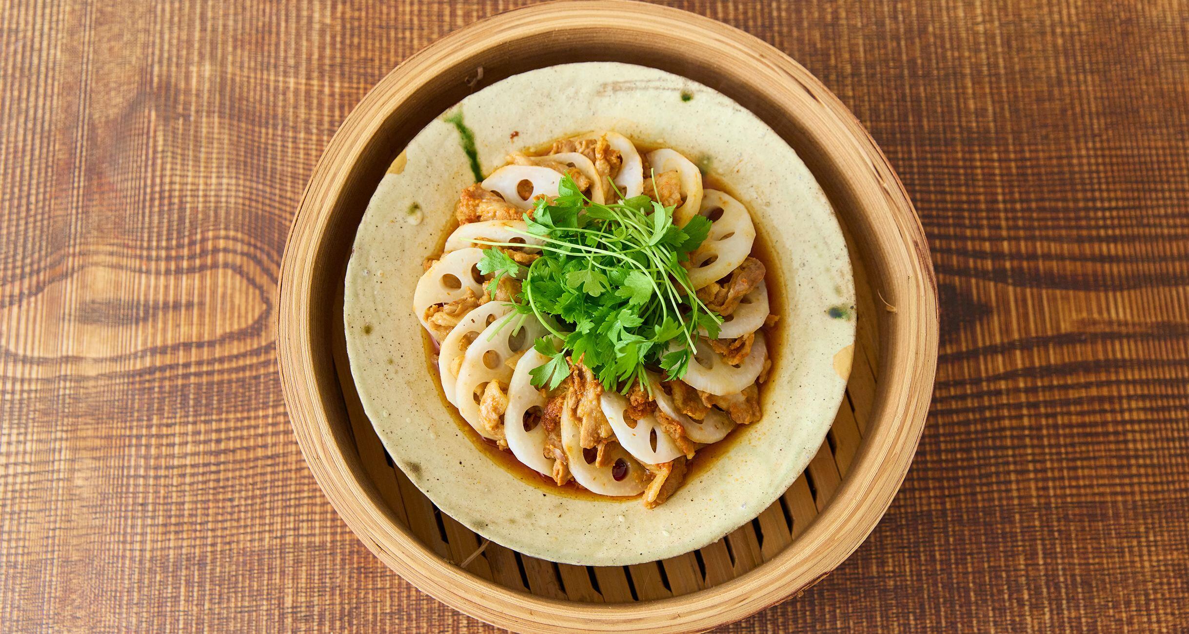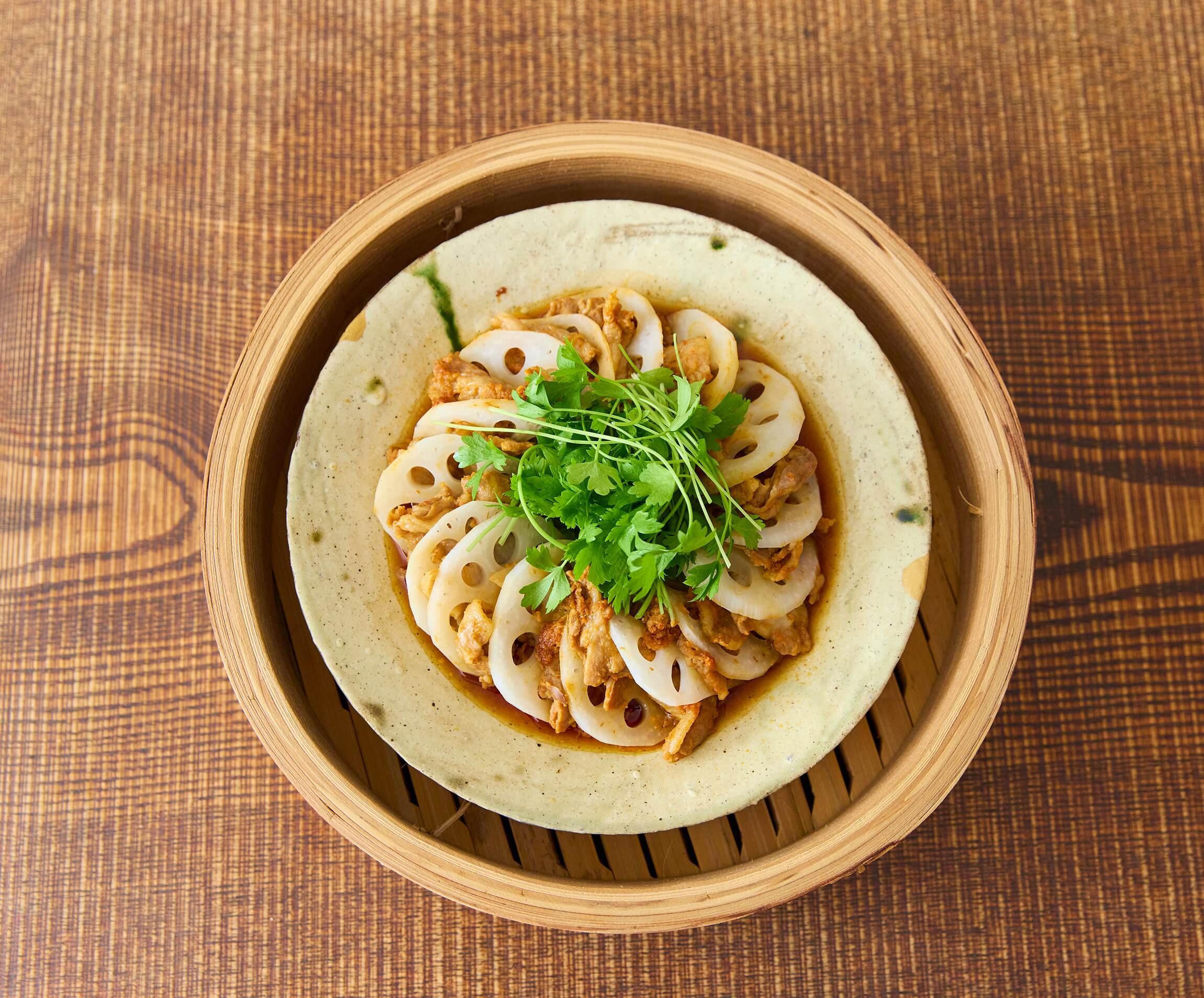 耐熱皿にれんこん、豚肉を交互に並べて蒸し器に入れる。蒸し器を蒸気の上がった鍋にのせて15分ほど蒸す。