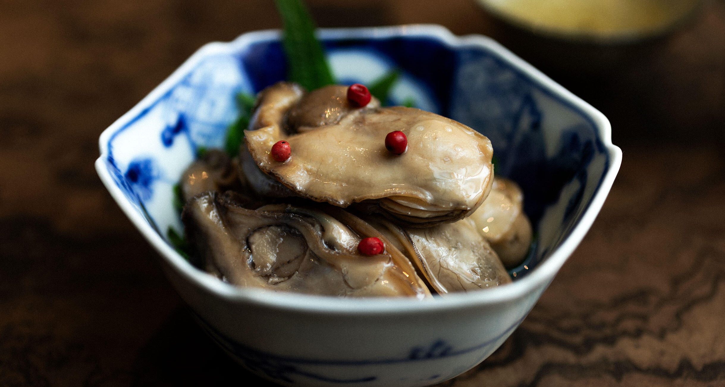 そんな左党憧れの酒肴盛りのレシピを今回特別にご指南いただいた。5品に共通するポイントは、シンプルながらも丁寧な下ごしらえにある。たとえば“牡蠣のオイル漬け”なら、水分がとぶまで十分にから煎りするから牡蠣の旨味が際立ち、身がふっくらと仕上がる。“あん肝煮”は身が崩れないよう優しく下処理し、さらに塩水で臭みを抜いてからようやく煮始めることで清らかですっきりとした味に。“海老芋の磯辺揚げ”は芋の下ゆでと下煮でねっとりとした海老芋ならではの食感を引き出す。“白和え”に使う豆腐は2時間から半日かけて水きりして、なめらかなテクスチャーに。“クリームチーズの味噌漬け焼き”も味噌床にチーズを最低5日間漬け込み、味がのるのを待つことで、焼いたときに味噌や酒粕の香りがふわりと開く。