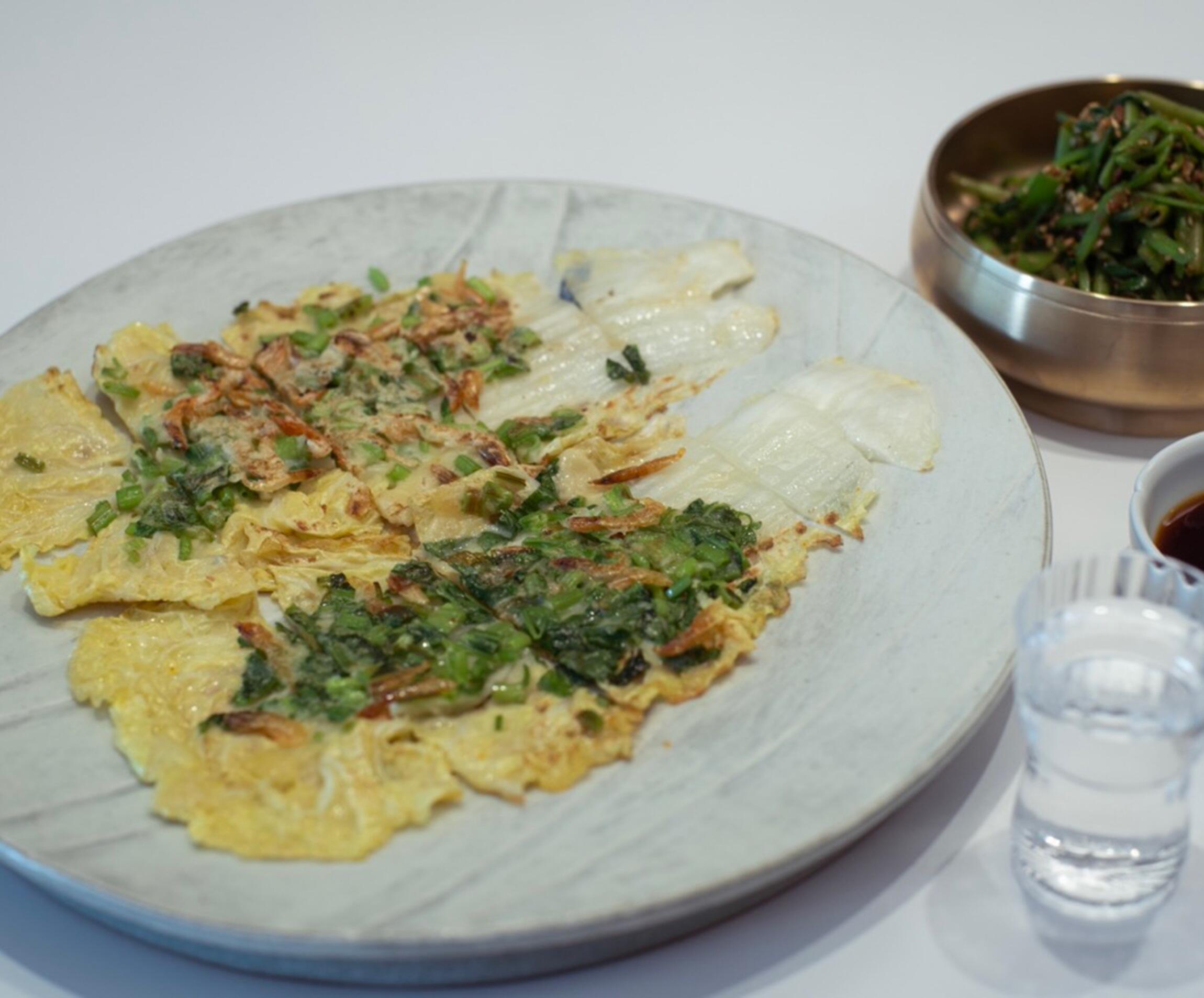 「白菜がおいしい季節によくつくるチヂミです。白菜は生でも食べられるから、さっと焼いただけで十分。生地には味付けをしないのですが、白菜のみずみずしい甘さとせりの青い味、干し海老の風味と旨味、そして焼き目の香ばしさが重なって。白菜、せり、干し海老だけとごくシンプルなのに、味わいはとても重層的なんですよ」(ジェリョンさん)