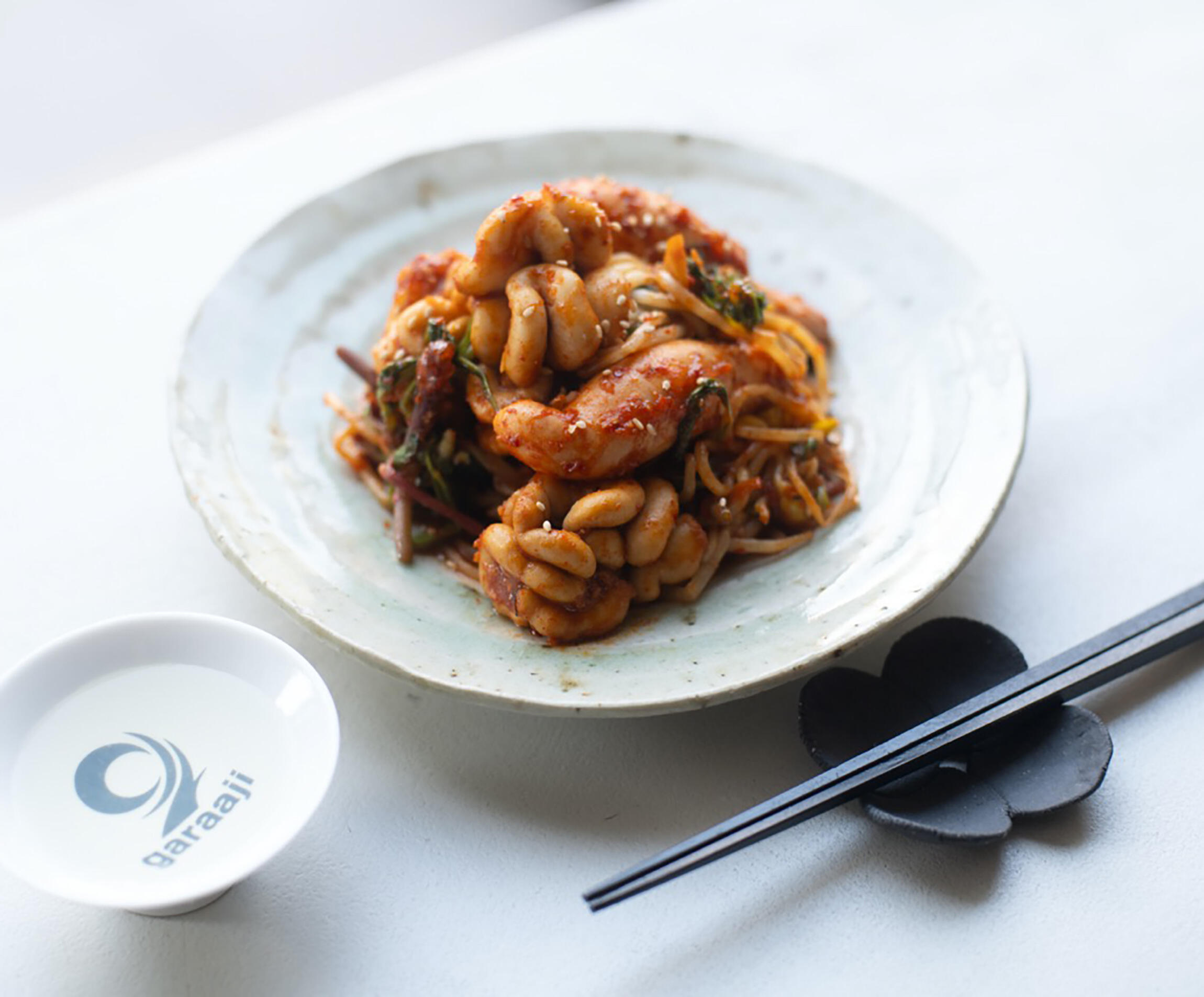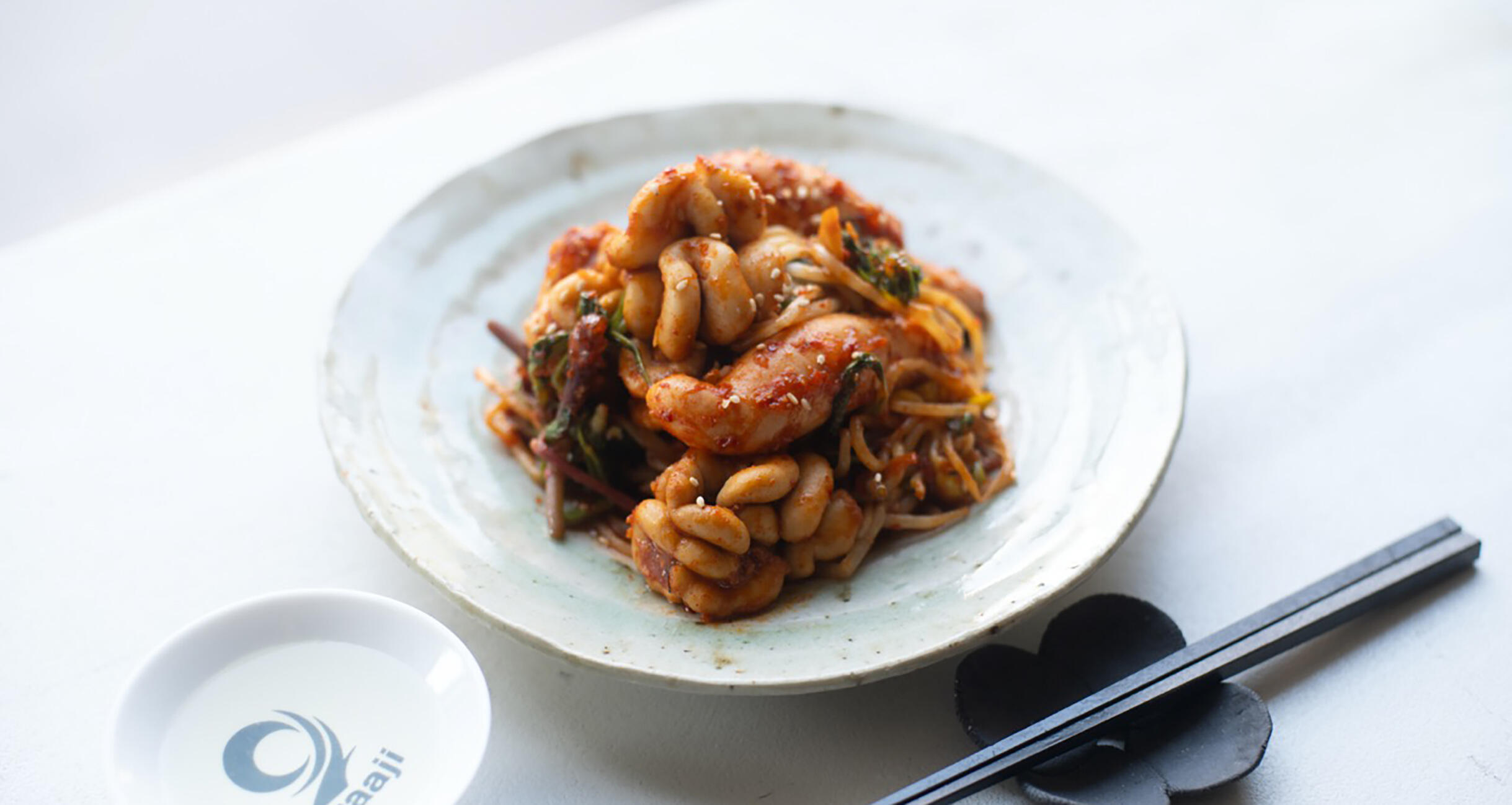 「私は済州島の焼酎と酒場が大好きで、もっと深掘りしたいと数年暮らしたことがあるんです。済州島の海鮮料理店や食堂でも、へムルチム(海鮮蒸し)はよく食べられる料理です。本来は魚やタコ、イカなども使いますが、日本でも購入しやすい塩たらこ(韓国でいう明太子)と白子を使って、簡単につくれるようにアレンジしたのがこのレシピです。たらこの塩味、白子の濃厚な旨味、そしてヤンニョムジャンの辛味とコクが合わさって日本酒が進みます!豆もやしとせりのシャキッとした食感もおいしいですよ」(ジスさん)