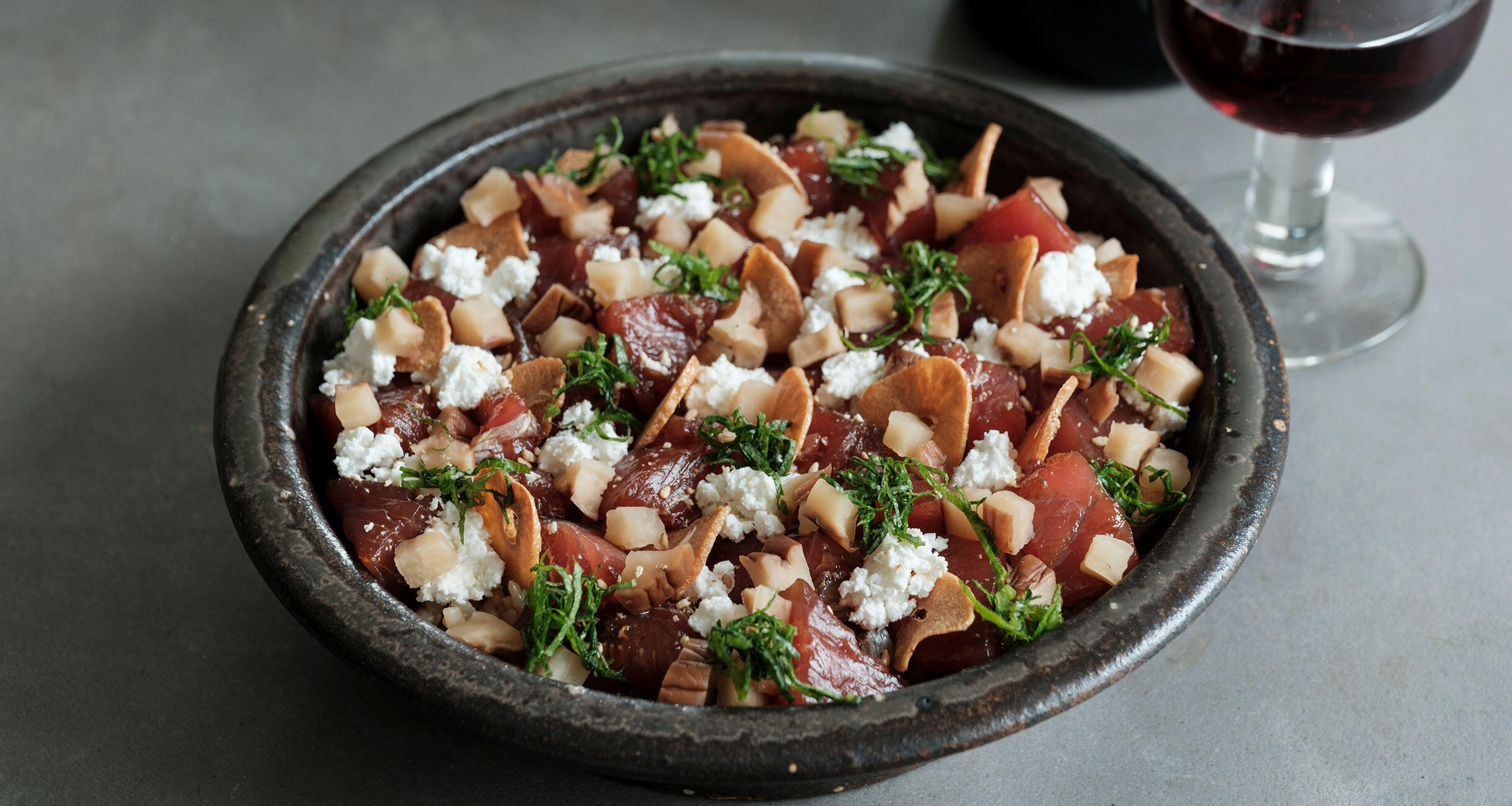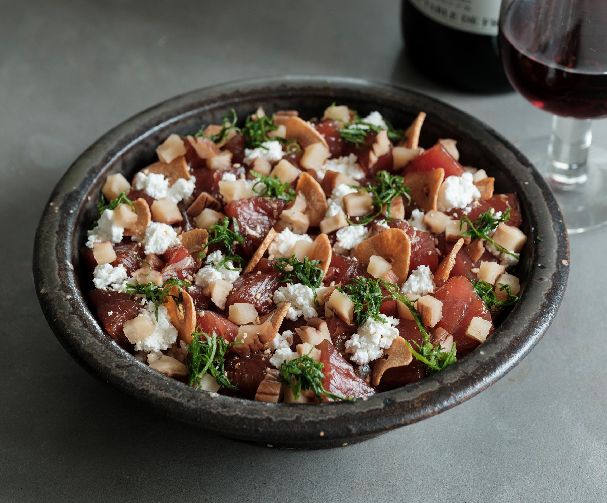 「そうなんです。メインの具材は、生姜だれで漬けにした鰹のたたき。ポイントはカリカリに揚げたにんにくチップとカッテージチーズ、そして赤酢の寿司飯です。鰹のような赤身の魚はもともと赤ワインと合うけれど、ガーリックの香ばしさとチーズの油脂分、赤酢の丸い酸味が、鰹の旨味を後押しして、赤ワインとの相性をさらにアップしますよ!」(真藤さん)