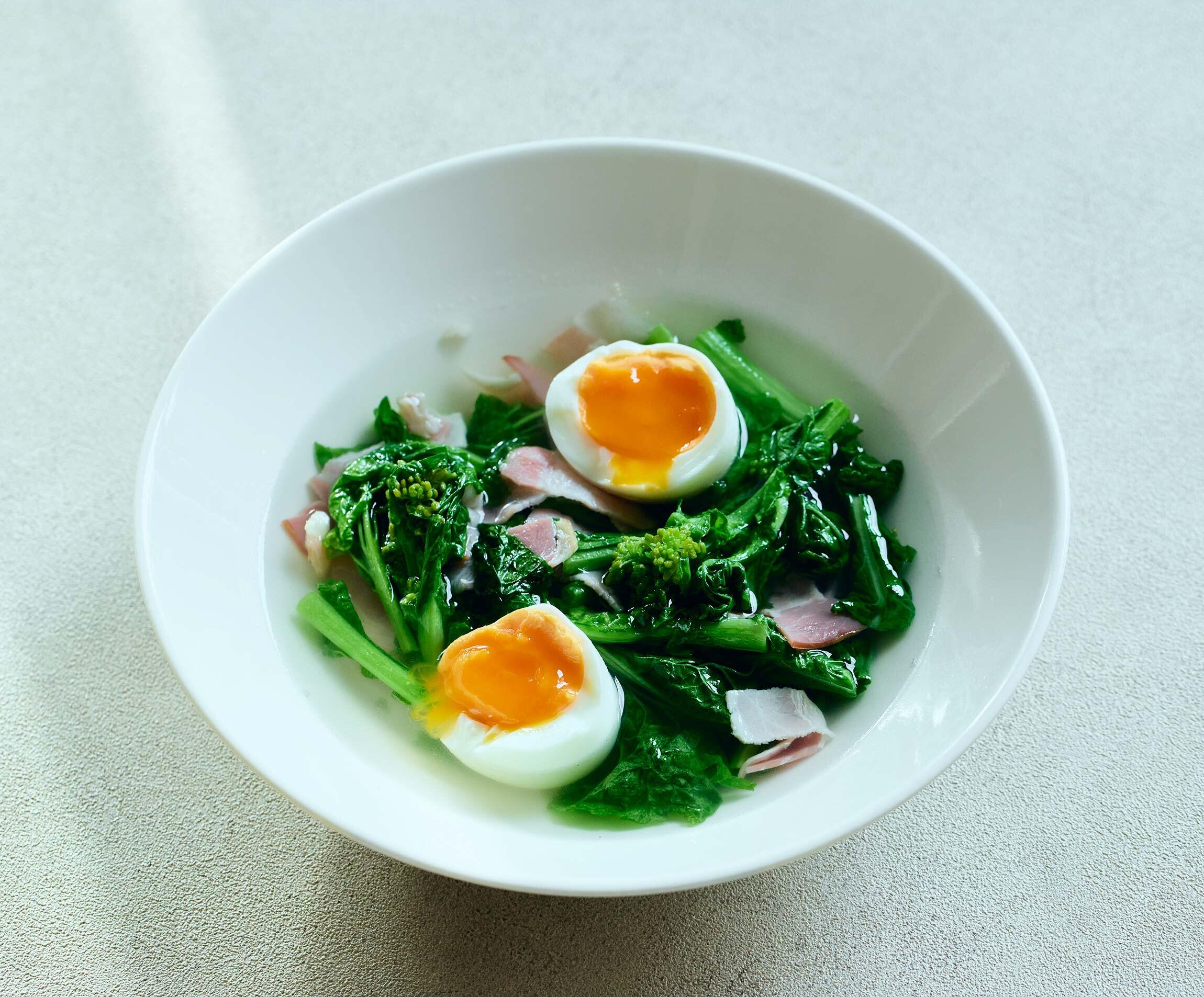 朝晩がまだ冷え込む4月って、温かくて元気の出るたまごスープを体が欲しますよね。ということで、スープ作家の有賀薫さんに、今お薦めの30品で4月1日から始まる「たまごスープ日めくりカレンダー」をつくっていただきました。毎日一品ずつ、30日で確実にたまご料理の腕が上がります。4月9日は春爛漫!「菜の花、ベーコン、半熟たまごのスープ」です。菜の花の苦味とベーコンの旨味と黄身のコクで、朝から幸せに満たされます。