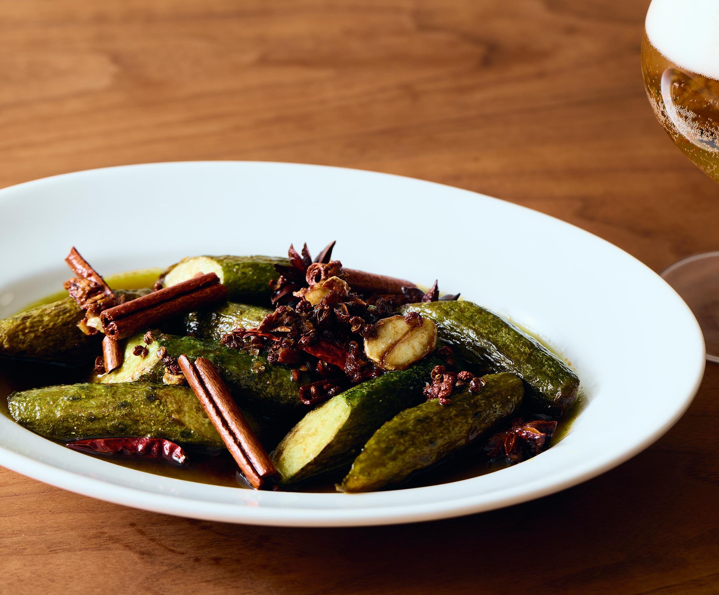 • 長時間火入れできゅうりをクタクタ&ジューシー食感に!多種多様なスパイスをまとわせ、芳醇ピリ辛に仕上げた「きゅうり焼き」/『メゼババ』髙山大シェフの「家つまみレシピ」