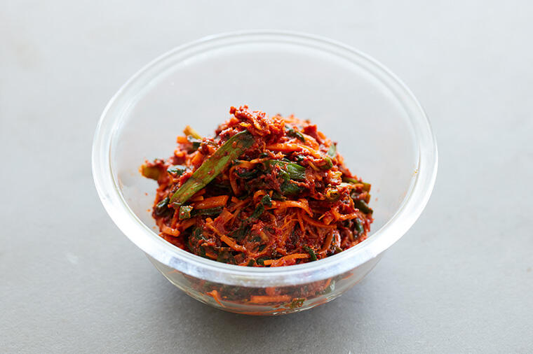ヤンニョム(薬念)とは、薬味や調味料を合わせたもの。自家製コチュジャンを使うことで、甘すぎず上品な味...