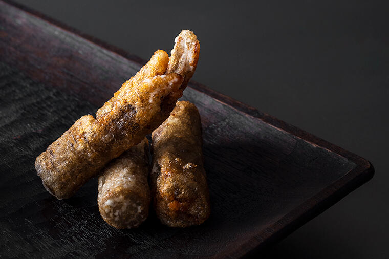 ごぼうにだしを煮含ませてから揚げるだけ!かじるとじわっと広がるだしの旨味が魅力の一皿です。器と料理の...