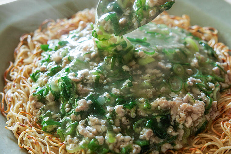 鶏挽き肉、生姜、わけぎでつくる和風のそぼろあんをたっぷりかけた、ちょっぴり懐かしい味の焼きそば。そぼ...