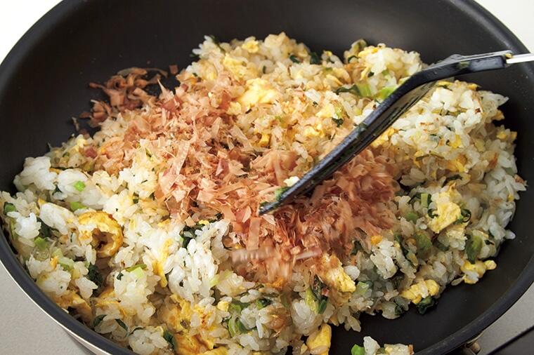 焼き目がつくまでしっかりご飯を炒めるのがポイント!野沢菜漬けとちりめんじゃこの食感もよく、おにぎりに...