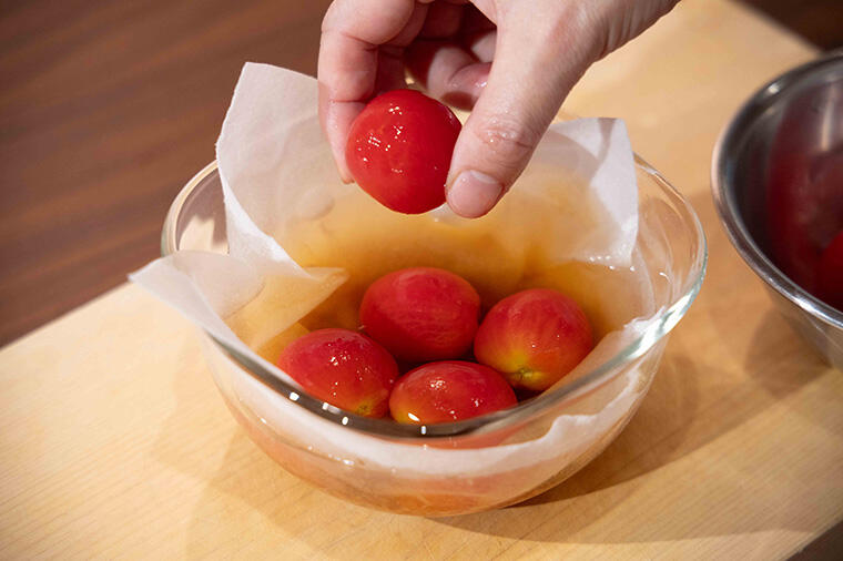 皮をむいたミニトマトとタラゴンビネガーをただ和えるだけのシンプル副菜です。トマト嫌いの人にこそぜひ試...